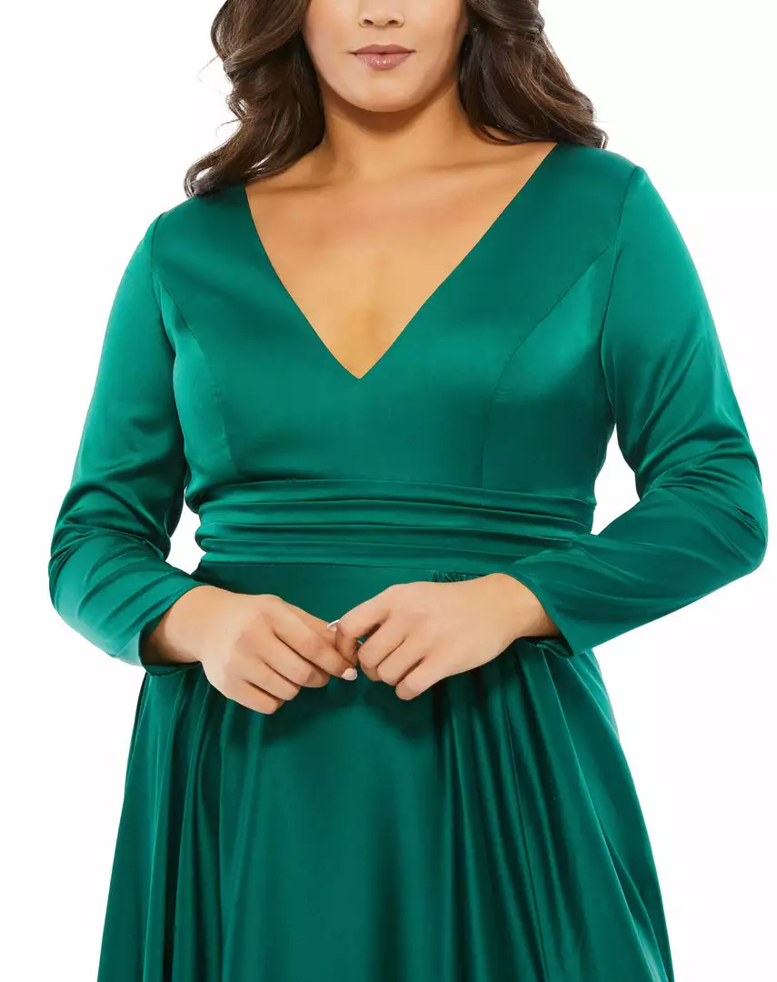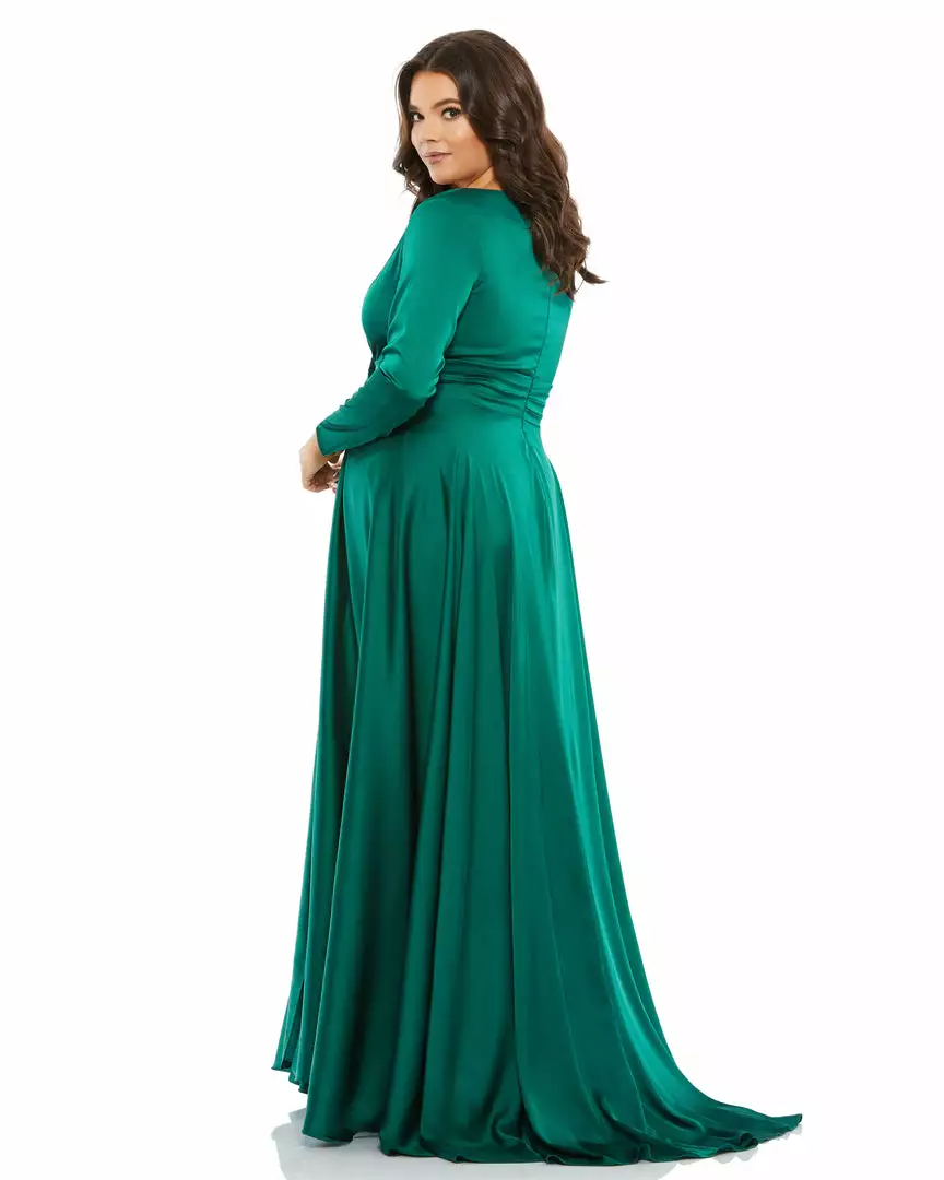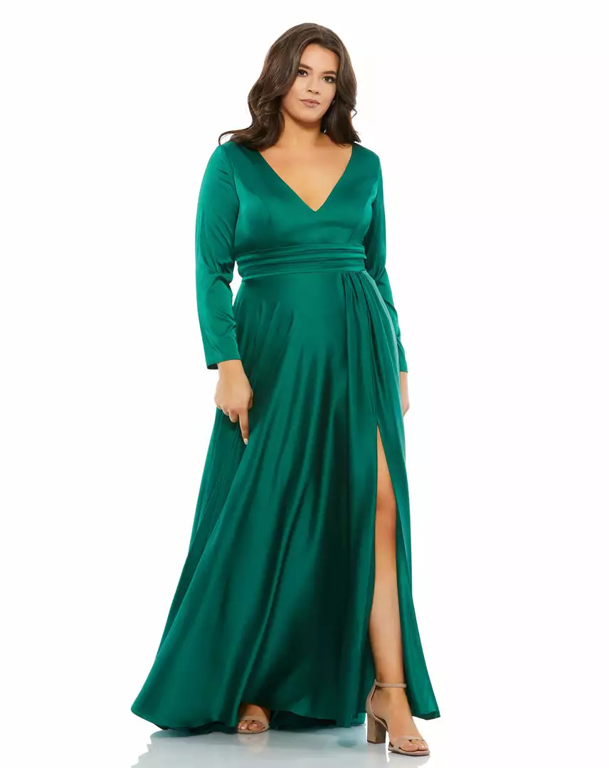 Classic satin evening gown with plunging v-neckline, long sleeves and thigh-high slit.