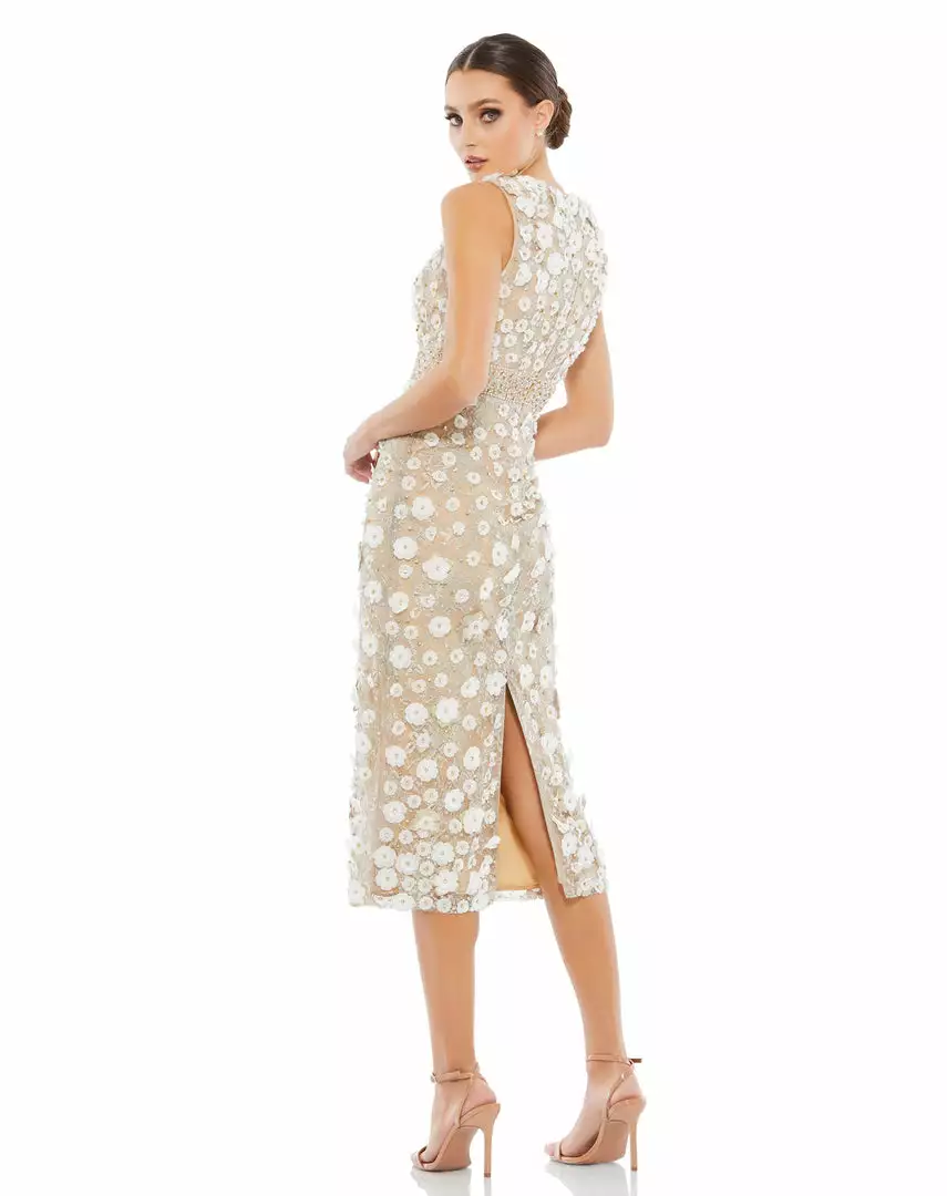 Sleeveless midi dress with a floral-embroidered mesh overlay, 3D flowers, and a hand-beaded waist.