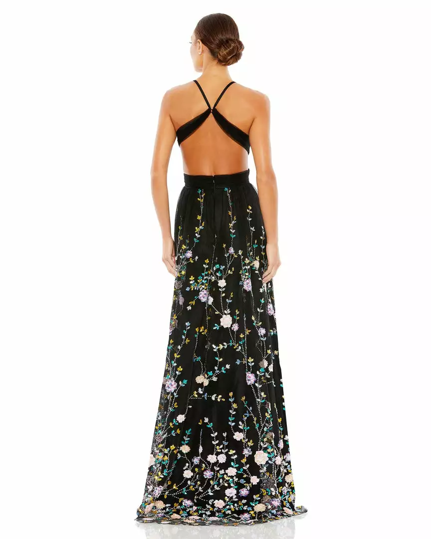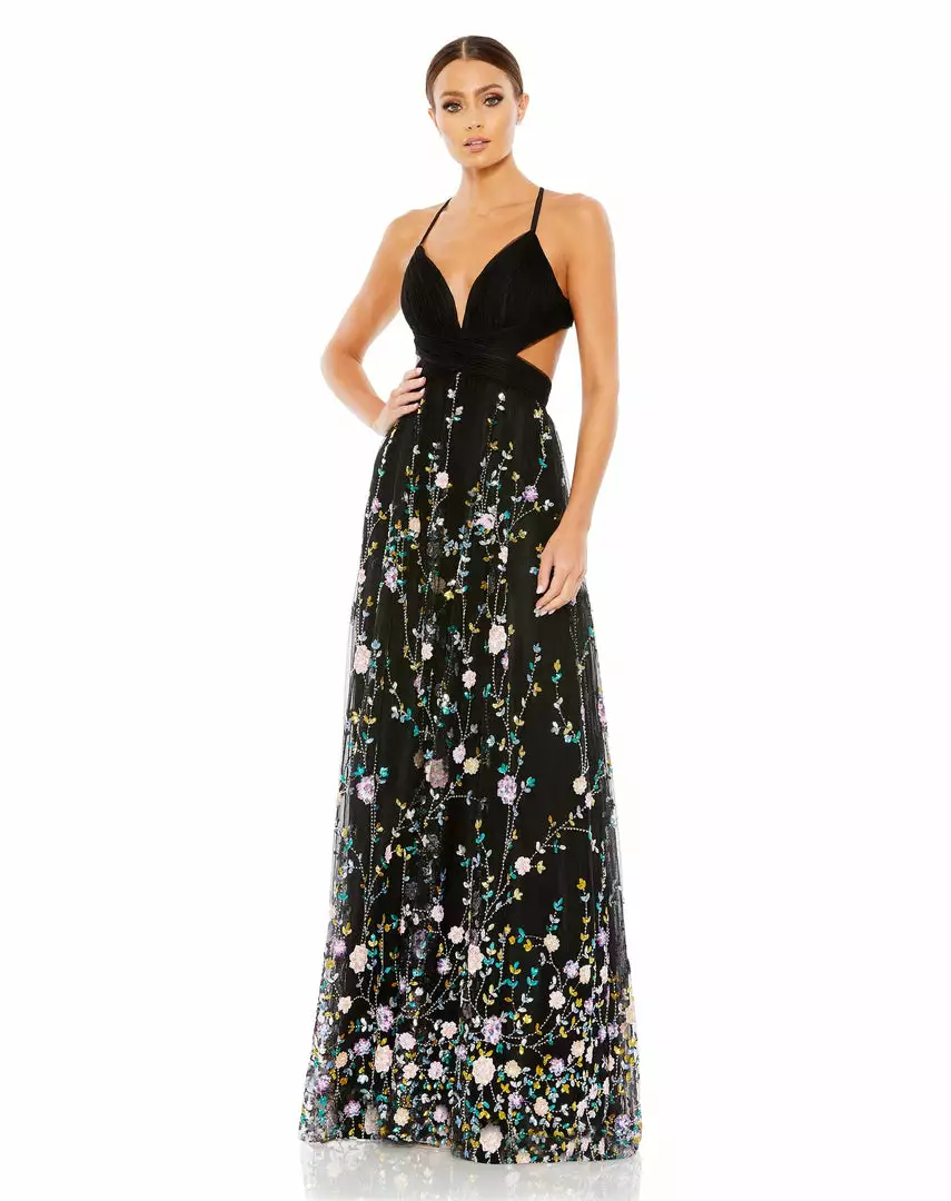 Abuzz with glittering sequin-arranged florals, this exceptional tulle gown is something special. Crafted with a padded, plunge-cut bodice, the dress highlights your body with a crisscross waist and cutouts that turn into a peek-a-boo back. The sleek, floor-grazing finish makes it elegant and easy to walk in.