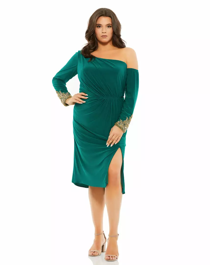Look no further for the perfect style to wear to a wedding, formal party, or social gathering — this jersey cocktail dress is it! Cut in a knee-length silhouette with an off-center slit, this elegant ruched dress opens with an asymmetrical neckline and features a single off-the-shoulder sleeve and ornately jeweled cuffs.