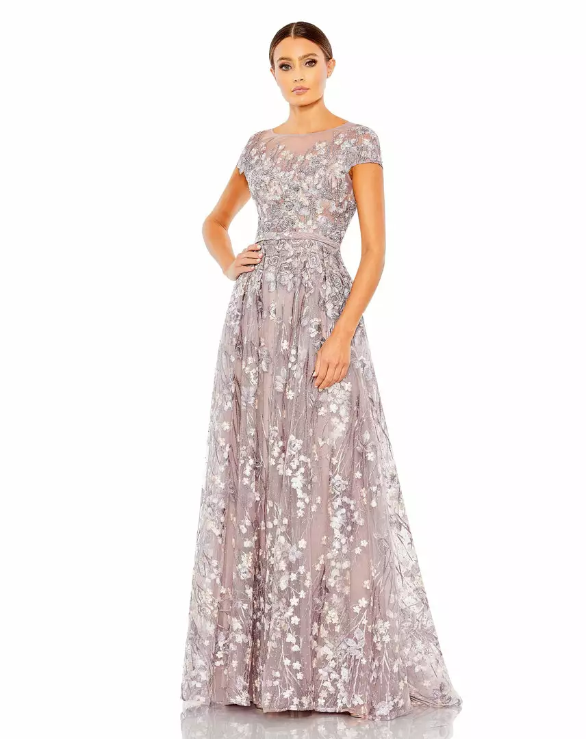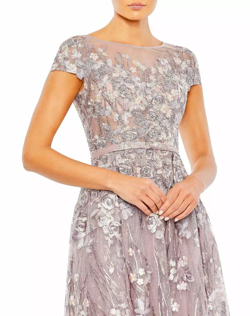 Be a vision in this masterfully crafted gown styled with a partially sheer, short-sleeve bodice, twinkling embellishments, and floral silhouette embroidery. Cut in an elegant A-line shape, the beautiful gown ensures you top the best-dressed list at any formal event, gala or wedding.
