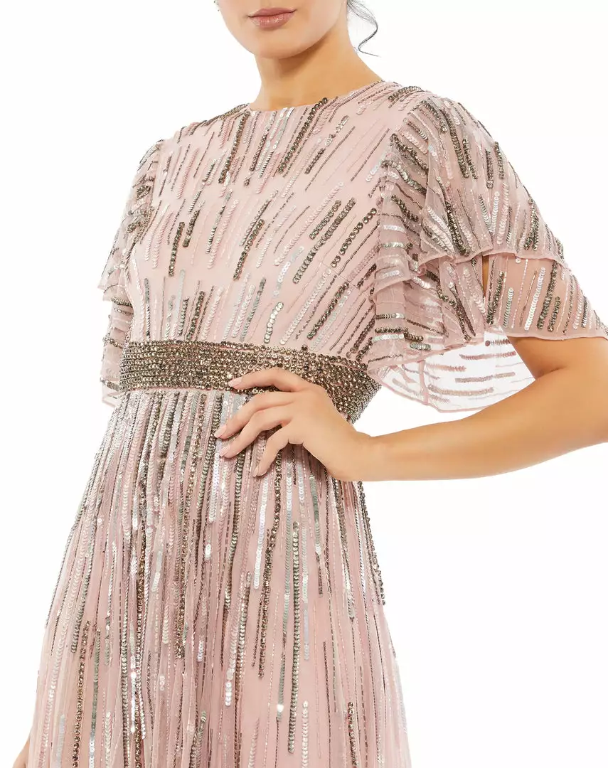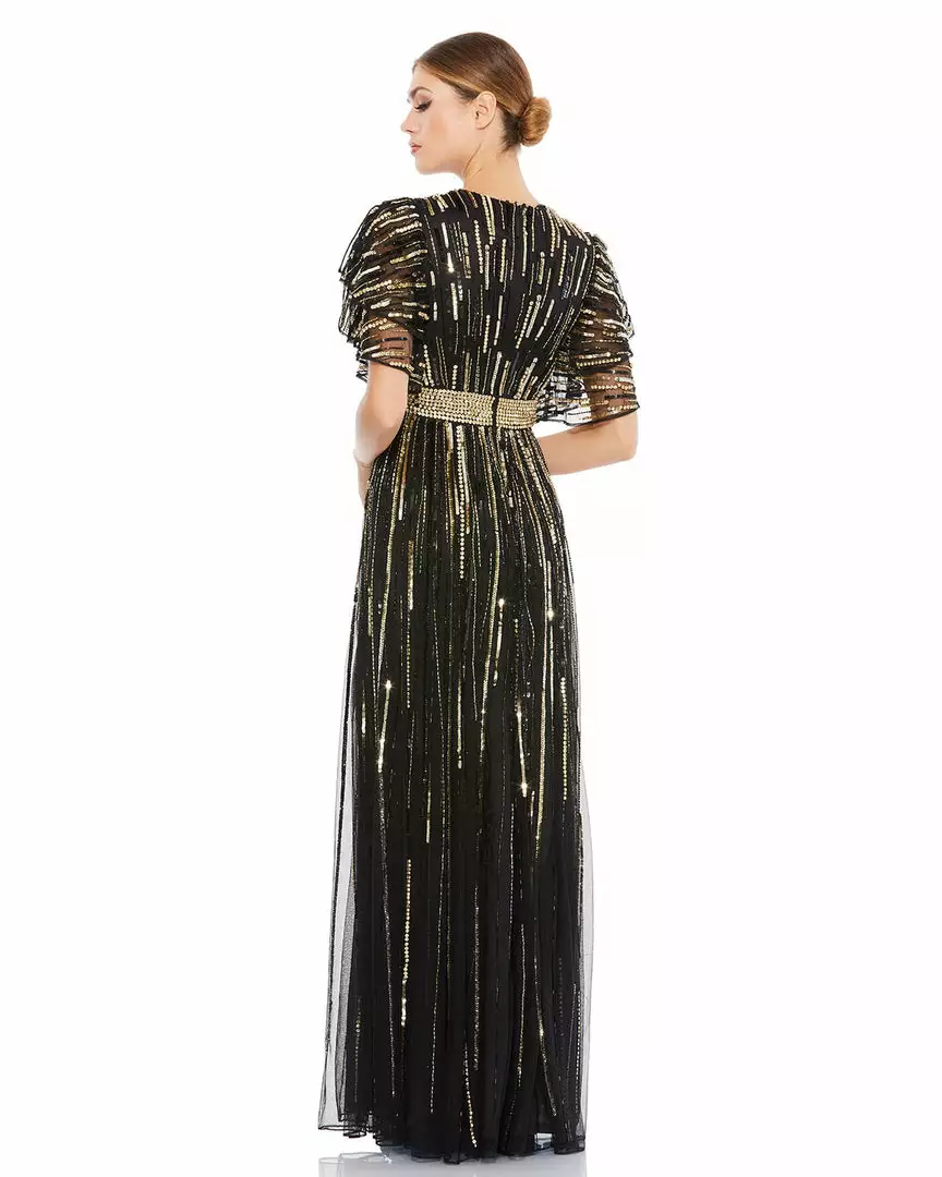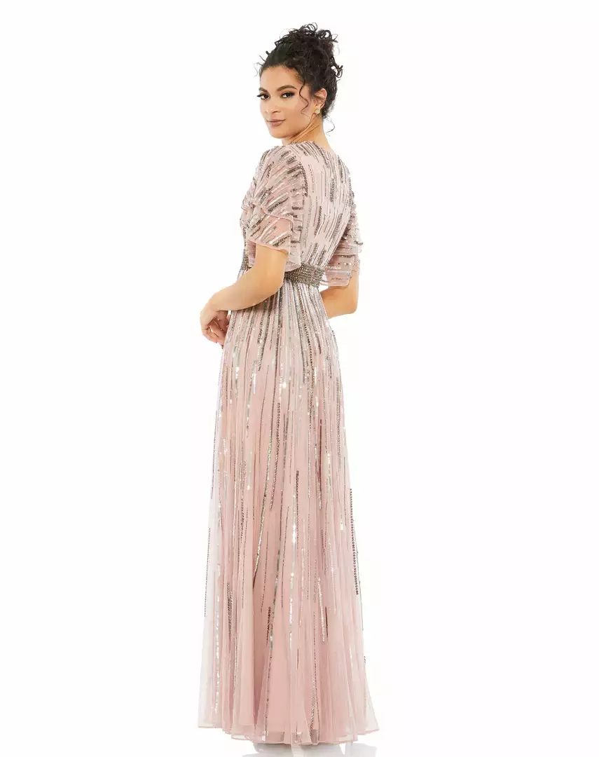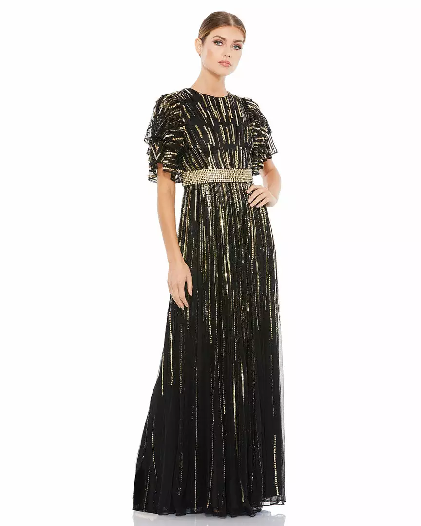 Stunning full-length gown with allover sequin and beaded stripe embellishment. Gown features a round neckline, layered short sleeves, and a dramatic bejeweled belt at the waist.Â