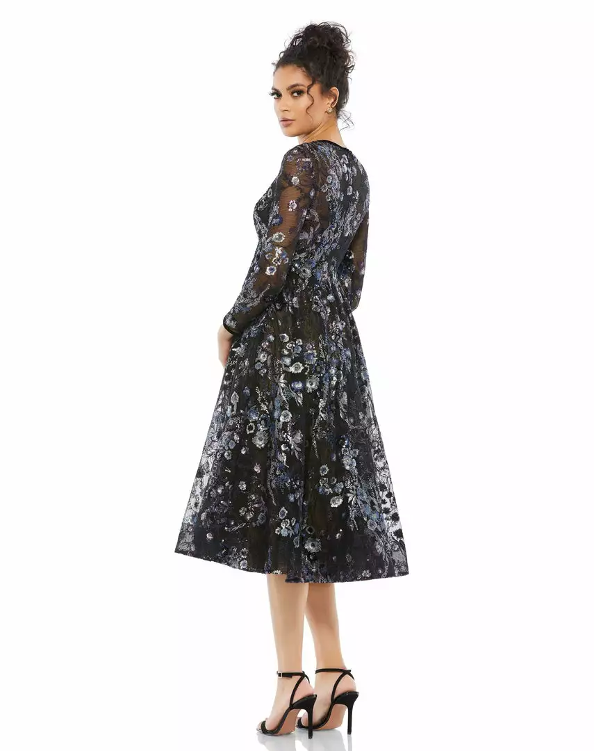 Mac Duggal Embellished Illusion Long Sleeve Midi Dress