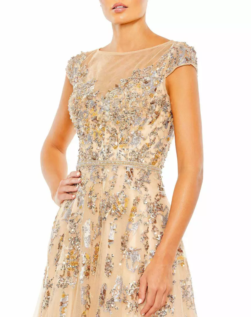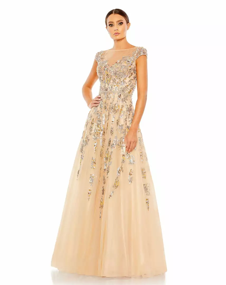 A princess gown fit for a magical evening. RSVP yes to your next event for your chance to wow in this sparkling tulle gown topped with an abstract assembly of metallic sequins. The dress is styled with a sheer bateau neckline, cap sleeves, and a crystal-encircled waist. A cutout back with a hook and hidden zipper closure reveals a sliver of skin.