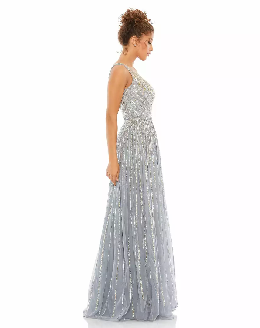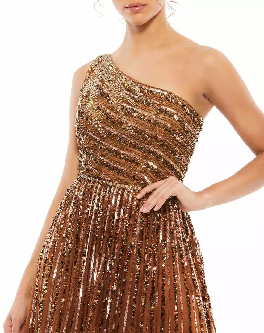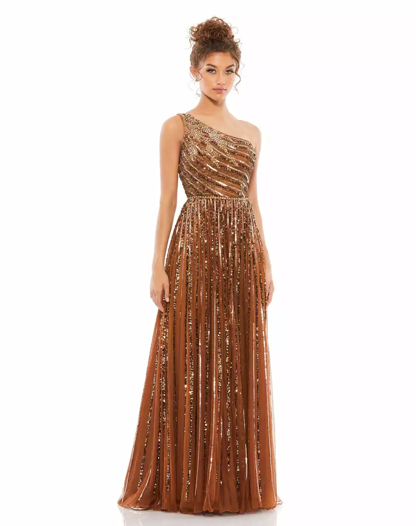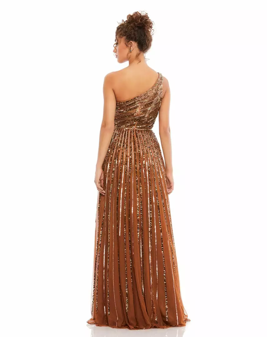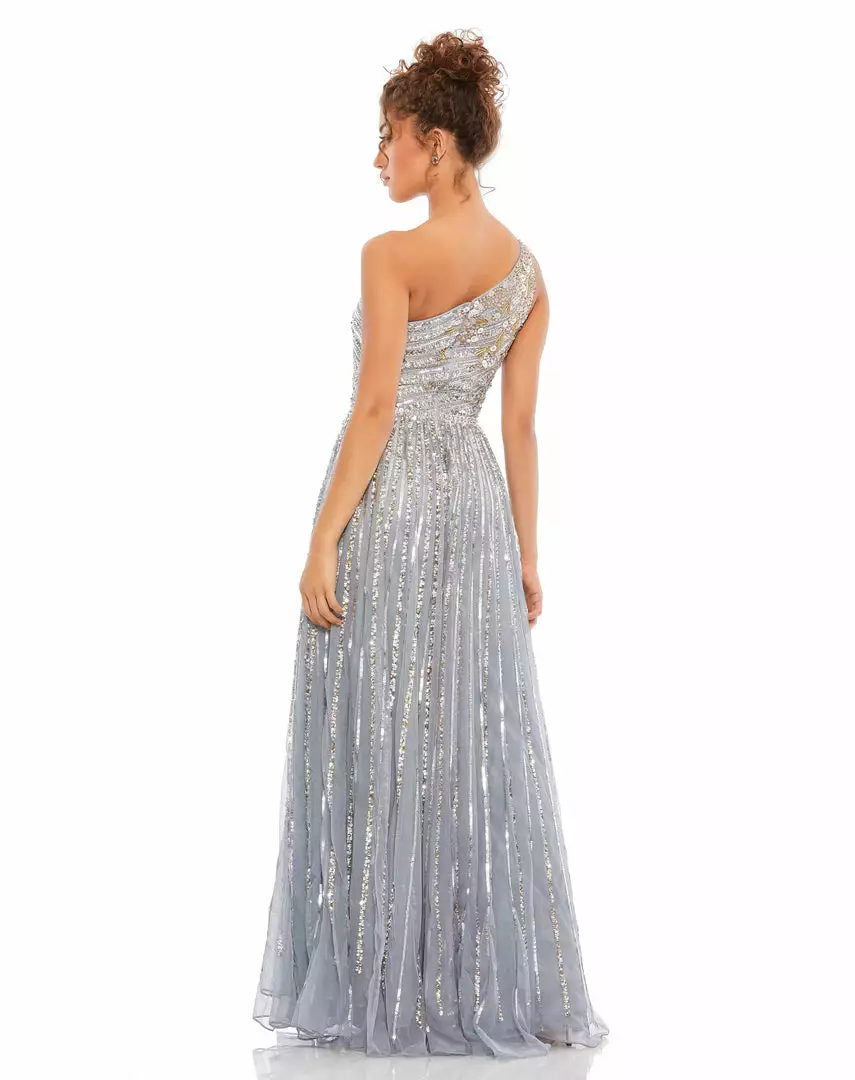 This stunning one-shoulder A-line gown is embellished with cascading diagonal rows of sequins and beads throughout the mesh overlay. The focal point of this gown is the beautiful bead work that lays at the top of the bodice. A dainty hand-beaded belt sits at the natural waist.