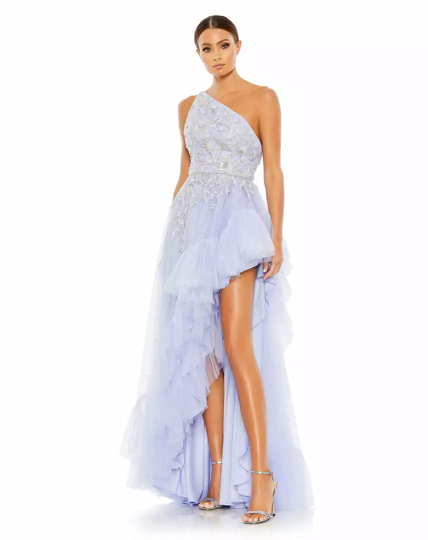 Made in a pretty shade of tulle with a lining to match, the unique gown is styled with a one-shoulder topline, botanical embroidery, glittering rhinestone accents, and ruffle trim. The dress trades a more traditional slit for a dramatic asymmetrical cut that highlights lots of leg.