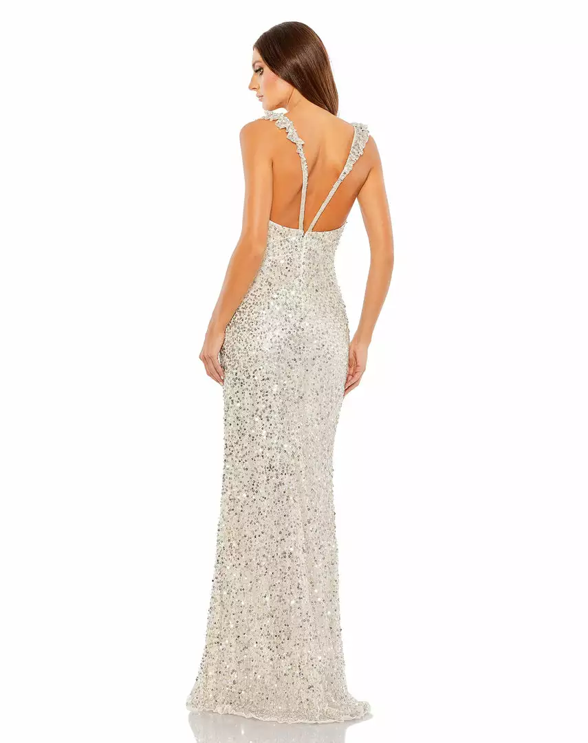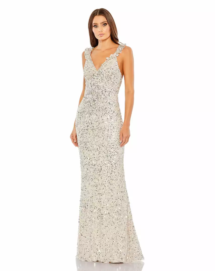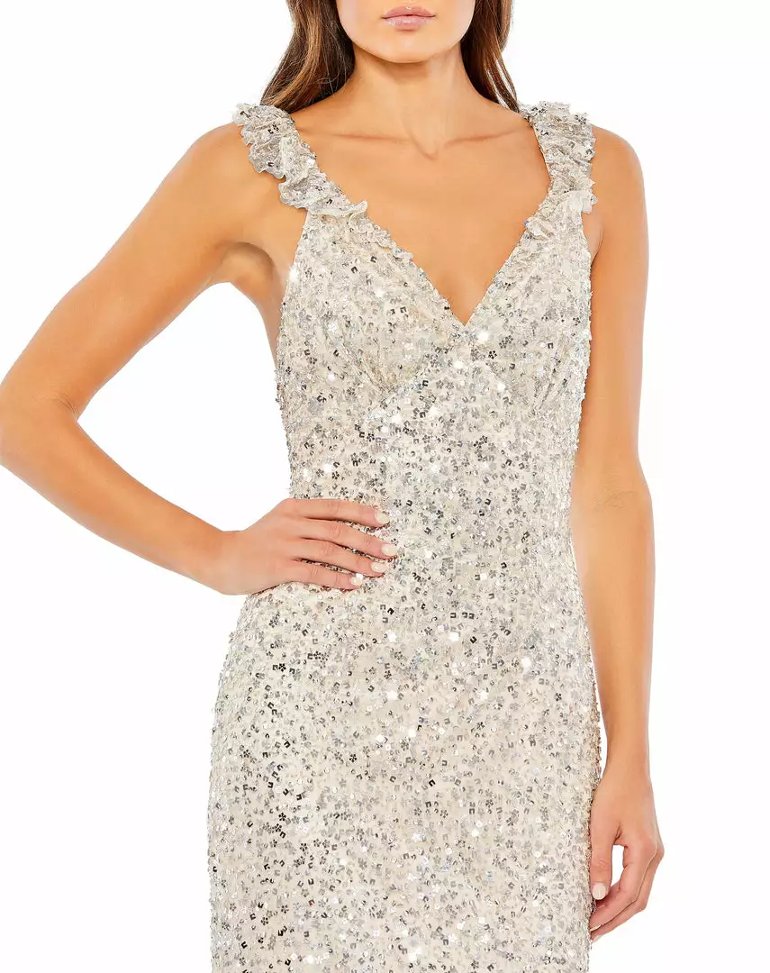 This pretty gown injects whimsy in the form of square and flower-cut sequins among its dazzling embellishments. The slimming dress is detailed with ruffled trim, gathering at the chest, and a sweet-meets-sexy V-shaped back. A glamorous pool of fabric delivers a luxe sweep train finish.