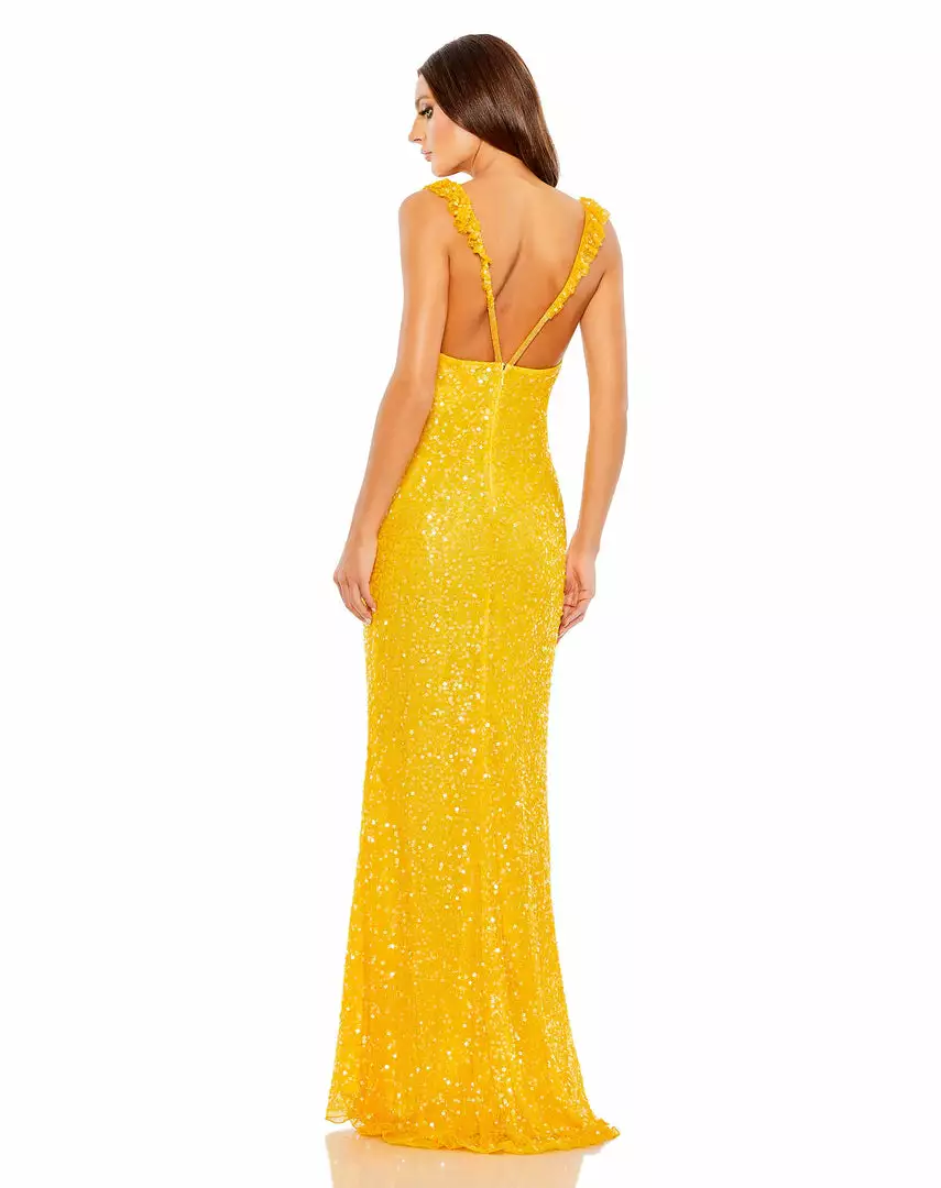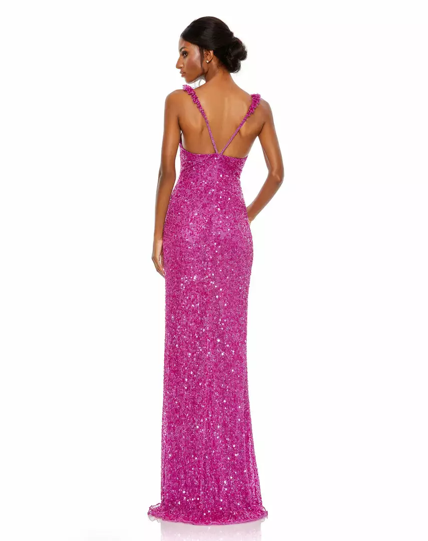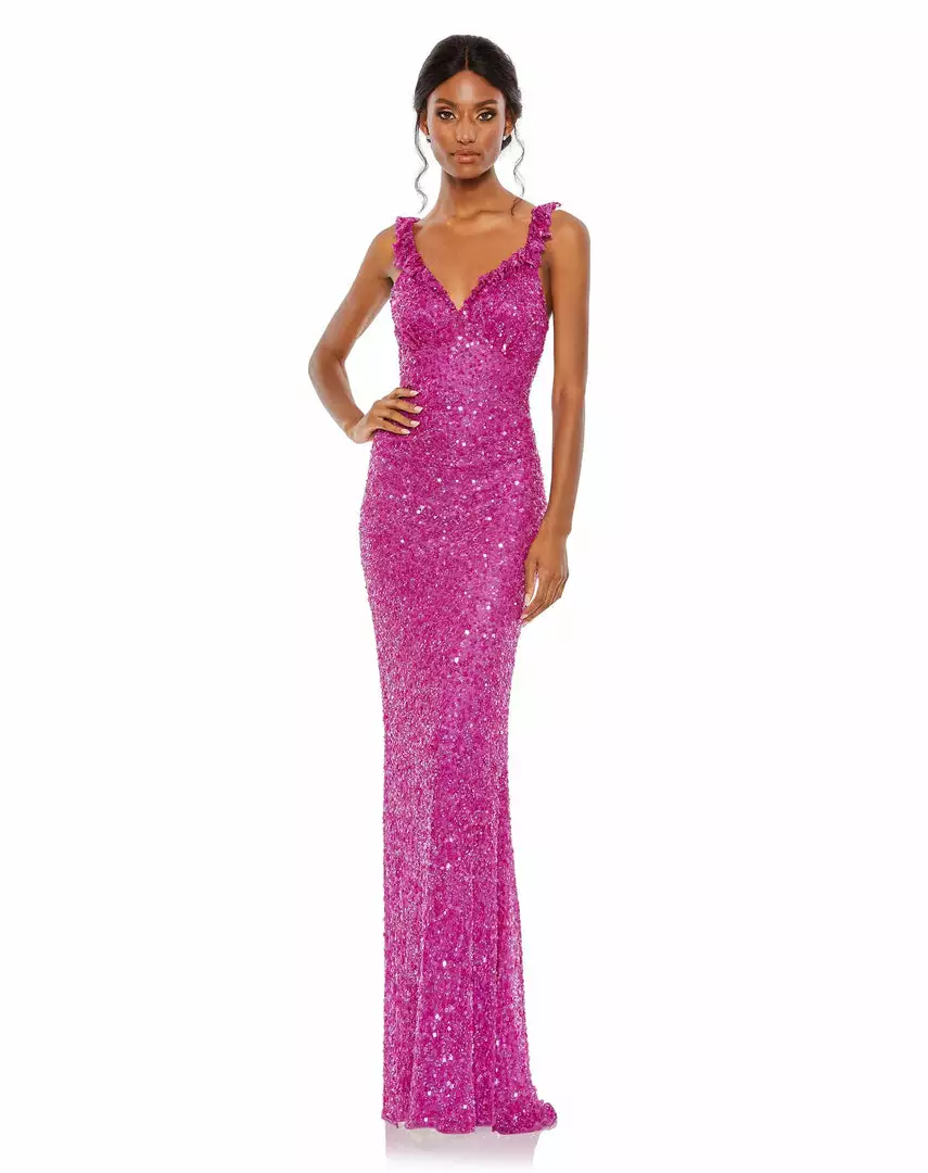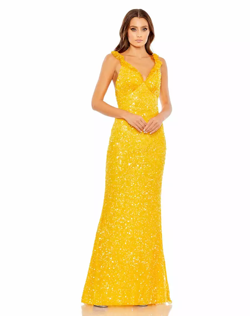 This pretty gown injects whimsy in the form of square and flower-cut sequins among its dazzling embellishments. The slimming dress is detailed with ruffled trim, gathering at the chest, and a sweet-meets-sexy V-shaped back. A glamorous pool of fabric delivers a luxe sweep train finish.