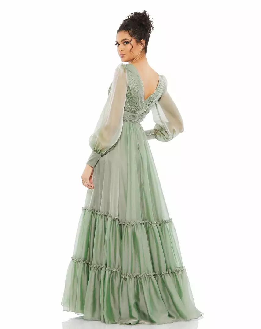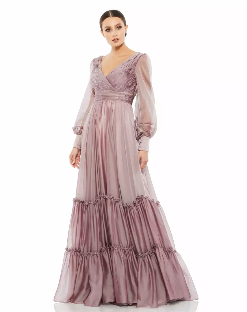 Romantic maxi dress with a pleated bodice and faux-wrap v-neckline, tiered floor-length skirt, and sheer long sleeves. Â