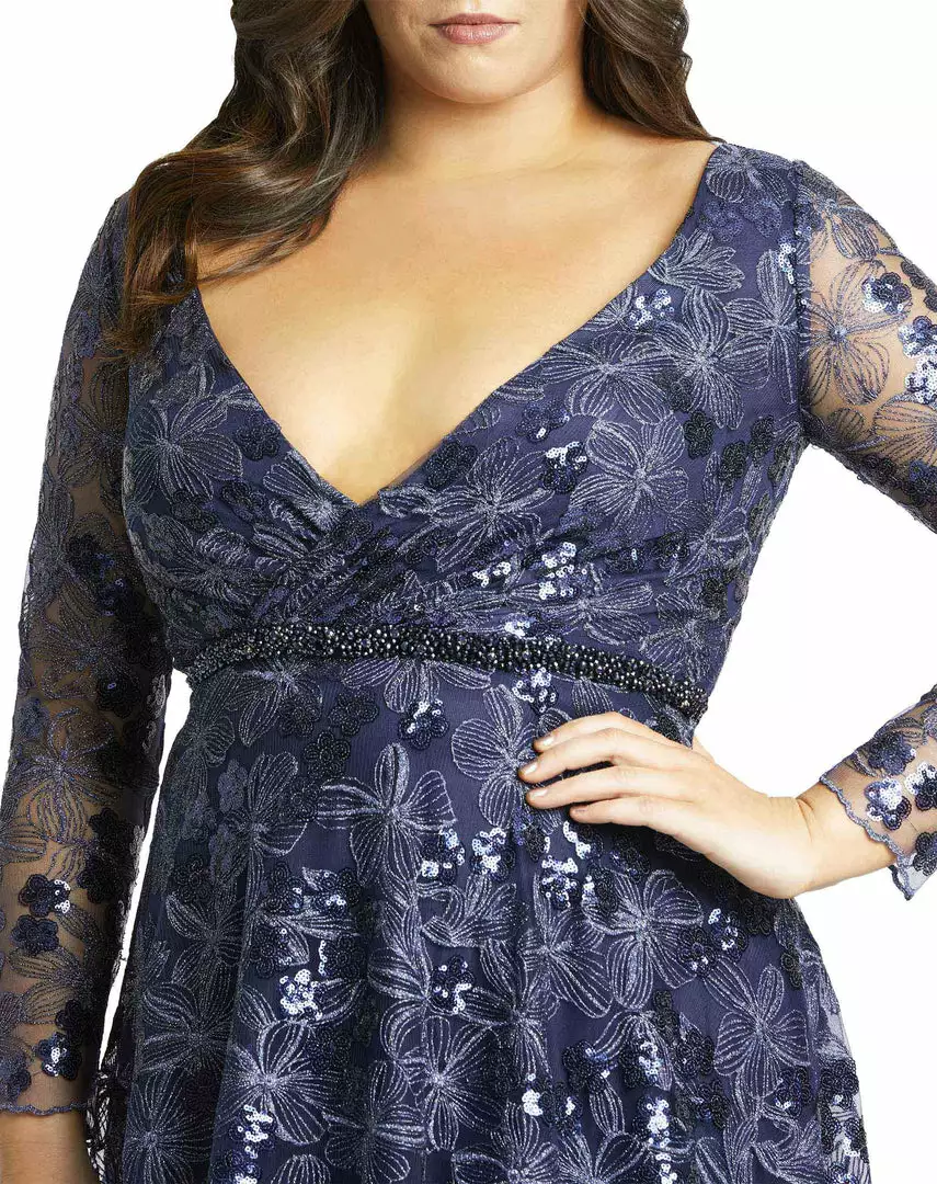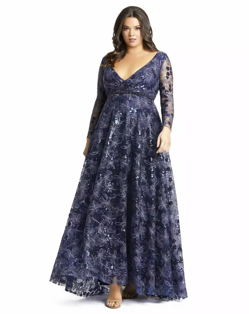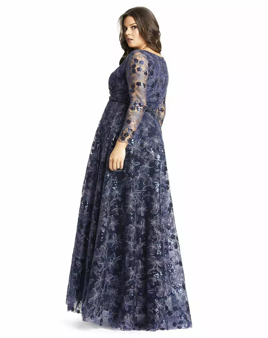 Embellished midnight gown with intricate floral applique and beaded empire waist.