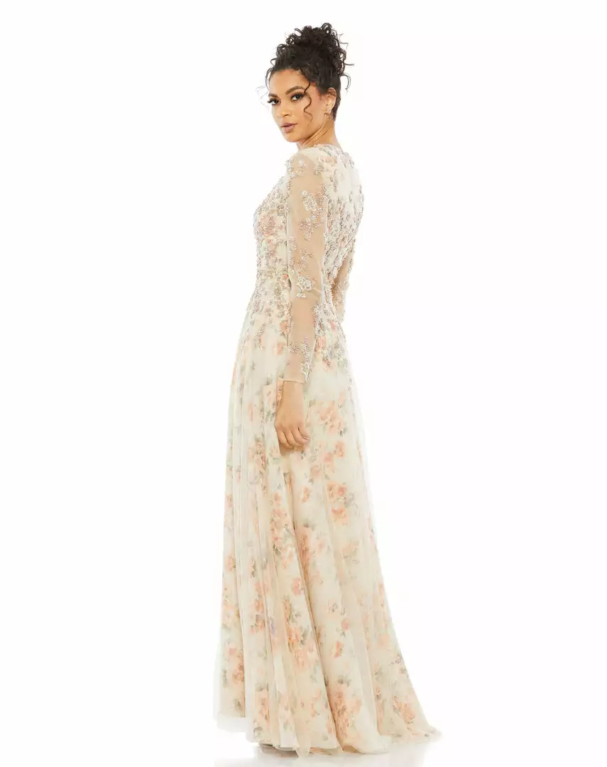 Beautiful floral printed gown with hand-beaded flowers across the bodice and semi-sheer sleeves, a delicate beaded belt, and a flowing floor-length skirt.