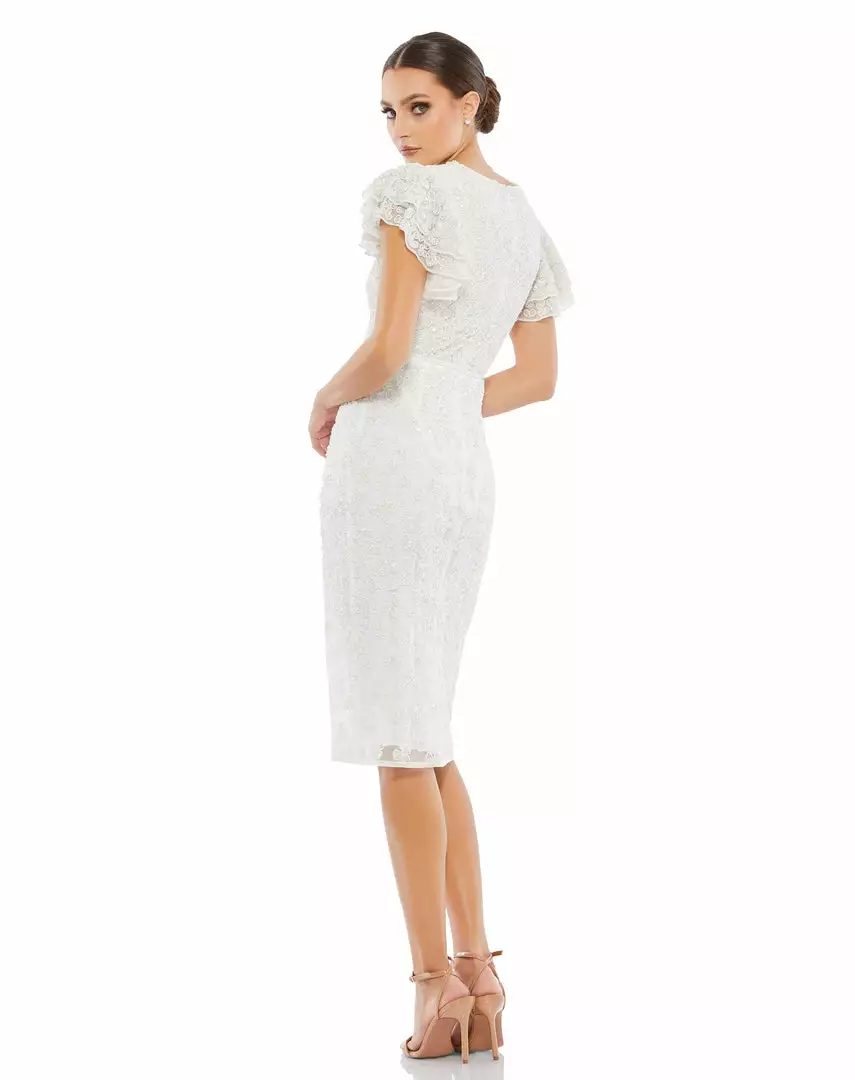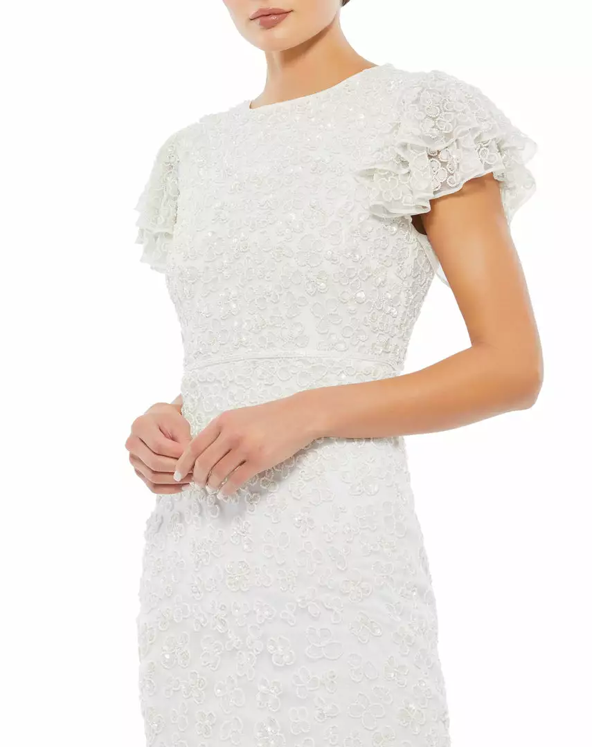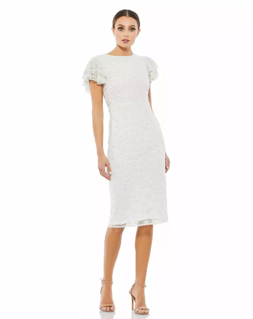 Chic beaded sheath dress with a high round beck, feminine flutter cap sleeves, and allover bead-and-sequin floral embellishment. Waist is accented by a dainty hand-beaded belt. Midi-length skirt features a back vent slit.