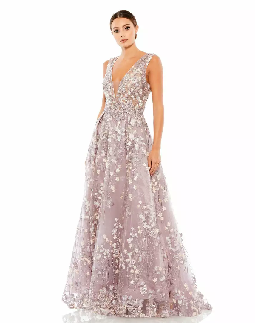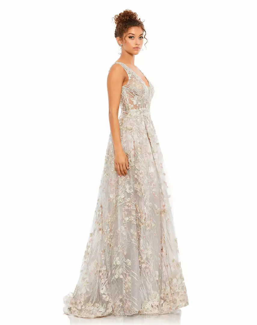 Gorgeous floral-embroidered gown with heat-set crystal accents throughout. The dress has a sheer mesh bodice with a v-cut neckline and back. The plunging illusion neckline features a sheer mesh inset mid-bust, and the floor-length skirt is finished with a sweeping train.