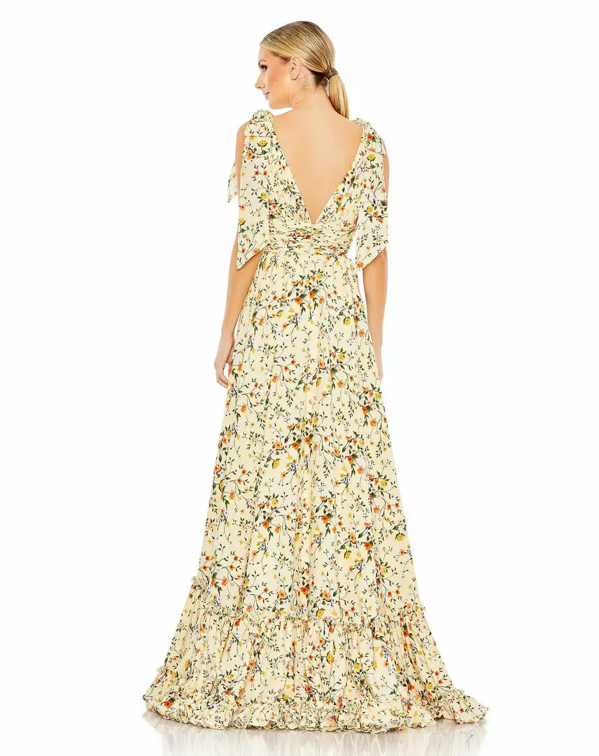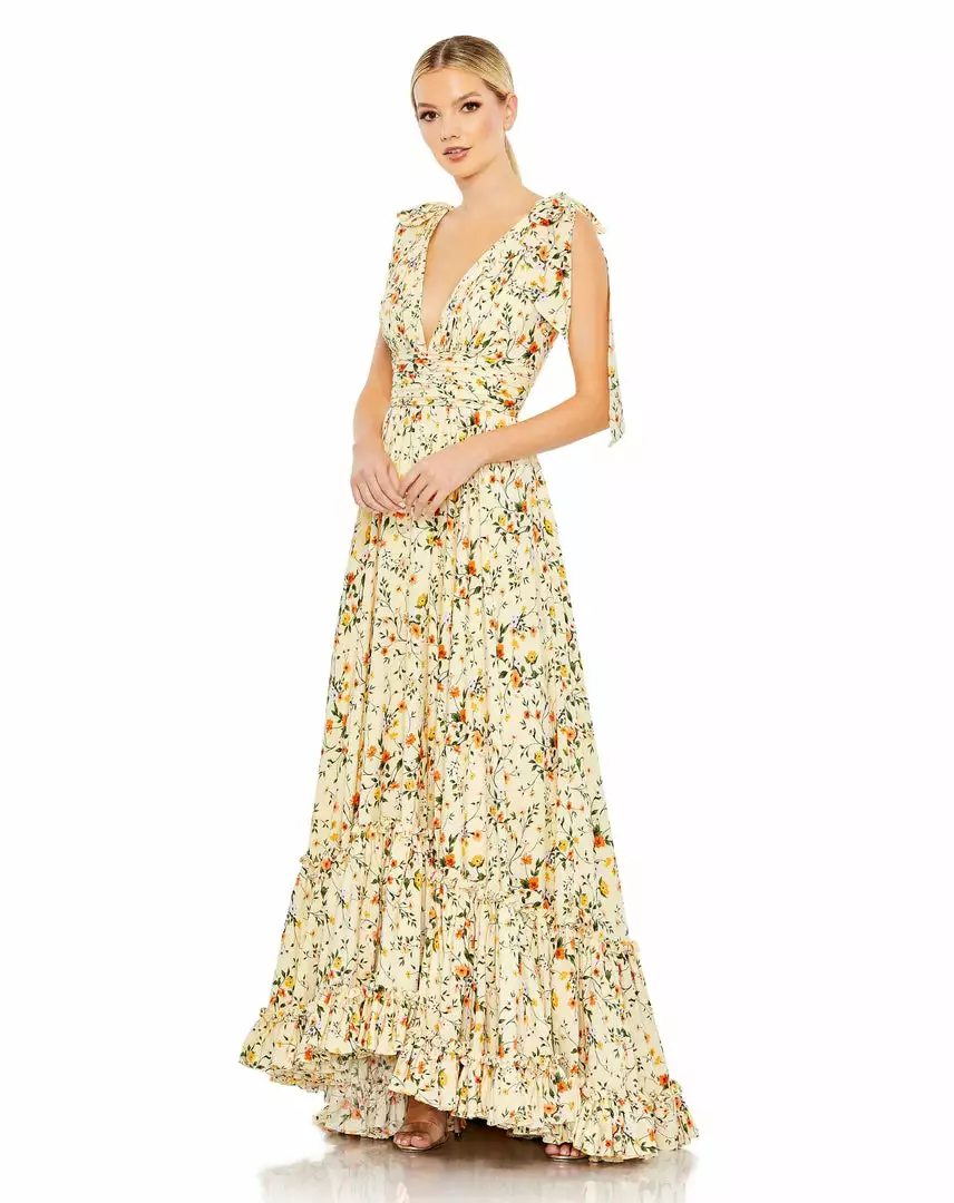 Mac Duggal Floral Print Soft Tie Sleeveless Tiered Gown Shop For