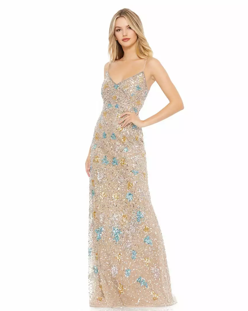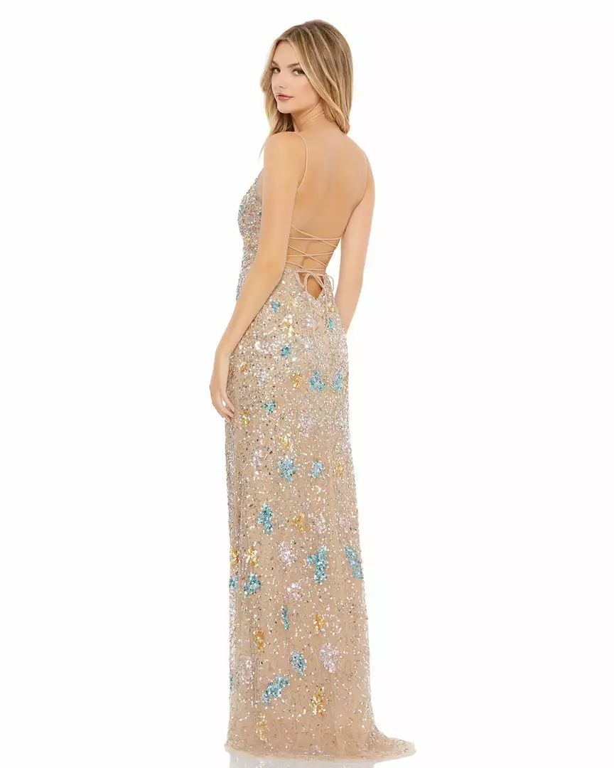 Sleeveless gown with gorgeous floral sequin and strappy back.