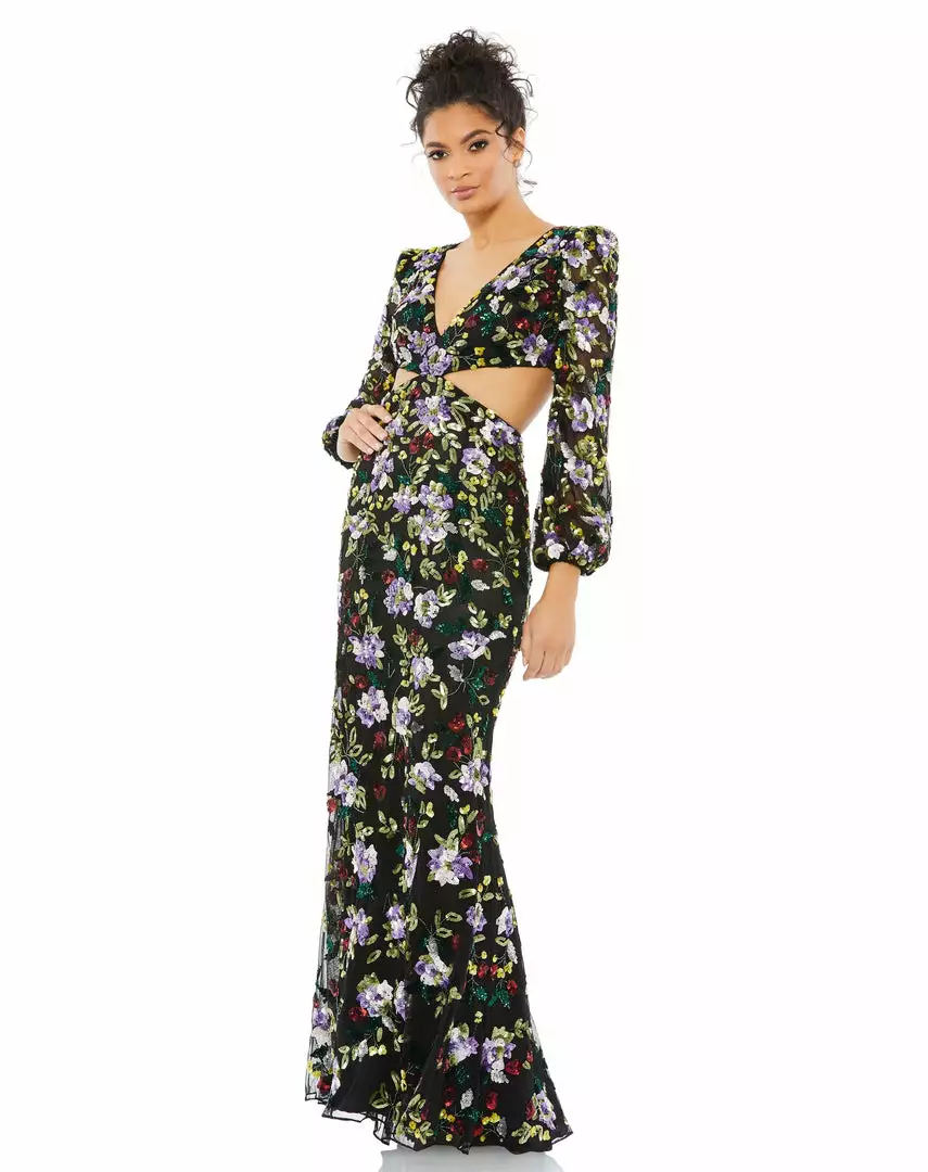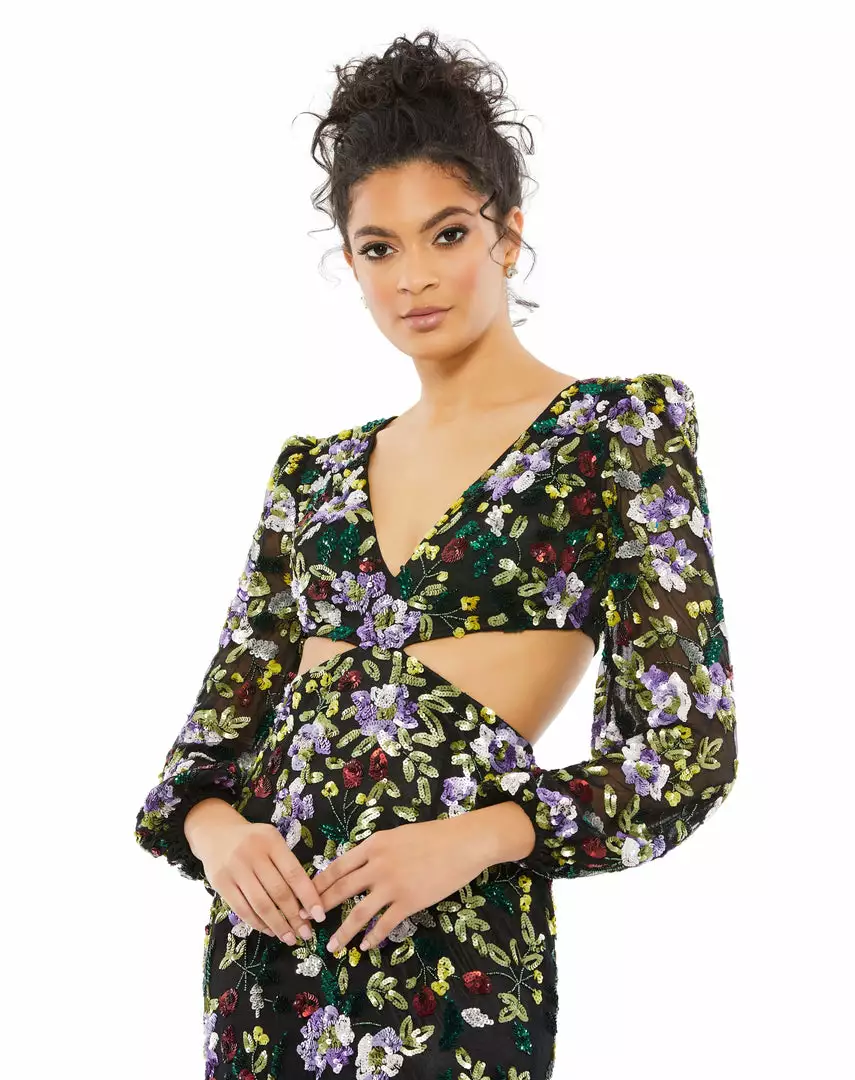 With a plunging neckline and sexy cutouts, this gown is a stunner. The semi-sheer blouson sleeves feature a slightly puffed shoulder, and the fitted, floor-length skirt skims the body with a slightly flared bottom. The mesh overlay is hand-embellished with floral-patterned sequins.