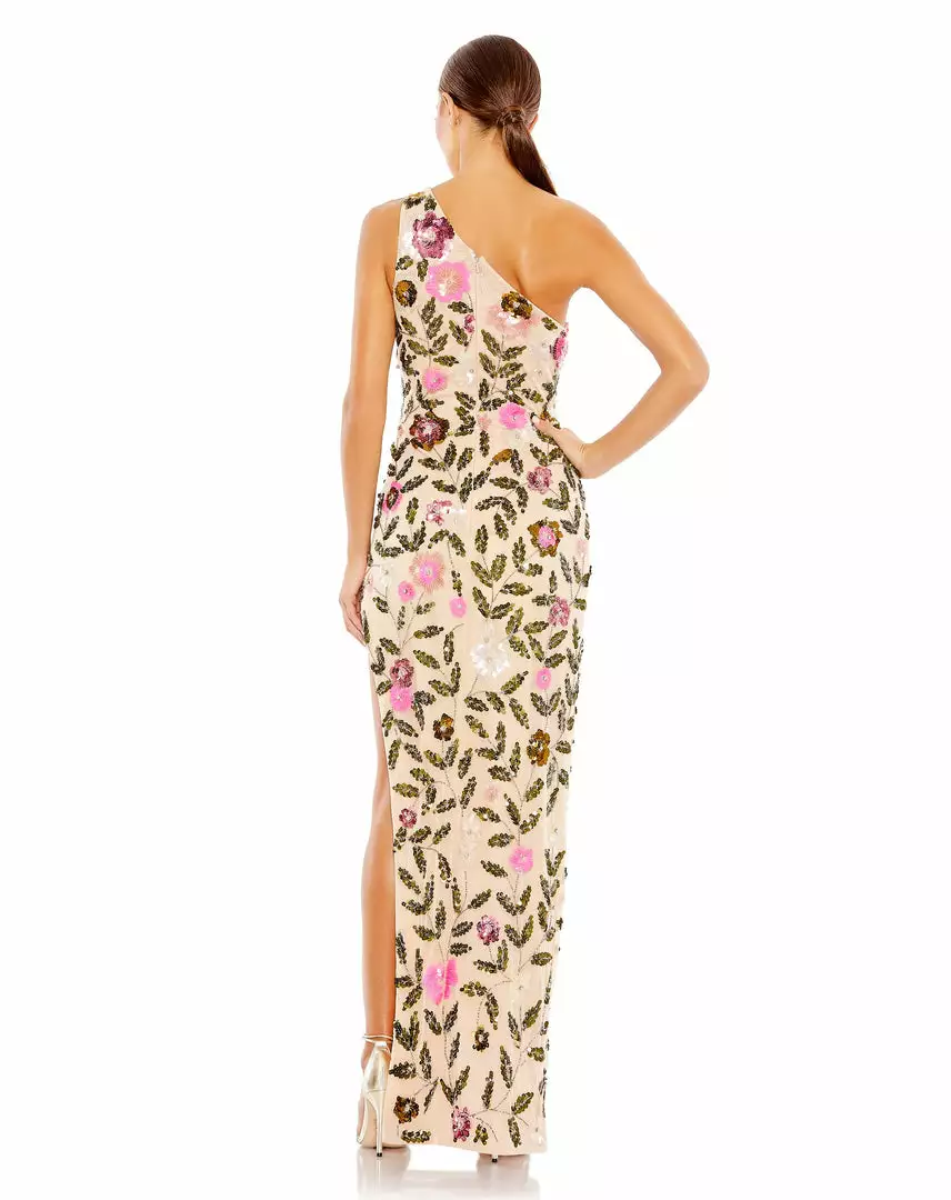 Mac Duggal Floral Sequined One Shoulder Column Gown