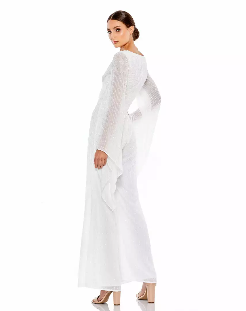 Chic sequined wide-leg jumpsuit with plunging neckline and dramatic bell sleeves