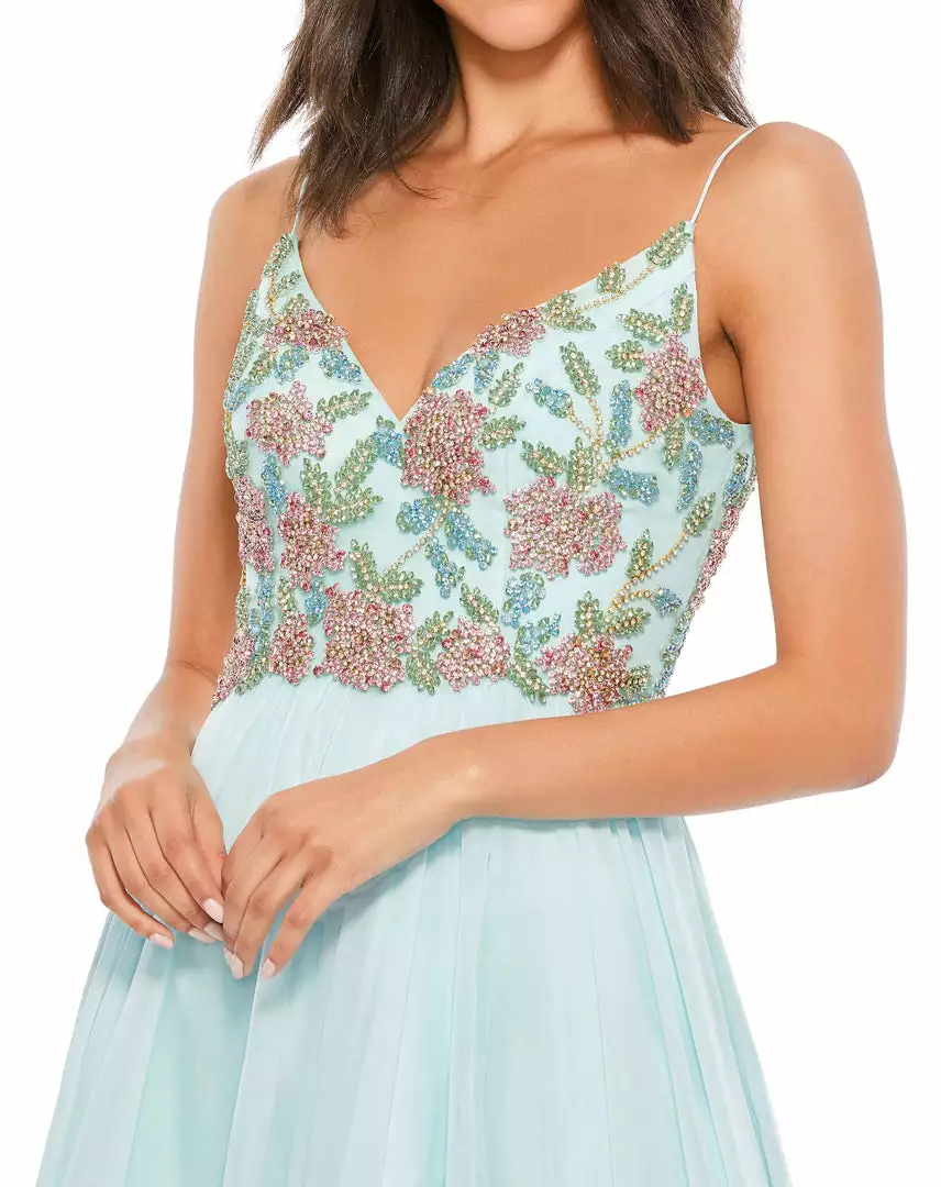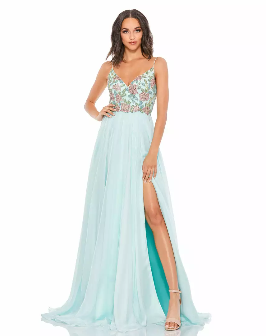 Glimmering embellishments on top, flowy, elegant chiffon at the bottom. This picture-perfect gown is cut with as stylish silhouette that showcases a V-neckline, barely-there straps, and fluid A-line skirt with a front slit. You’ll love the corset-inspired lace-up back.