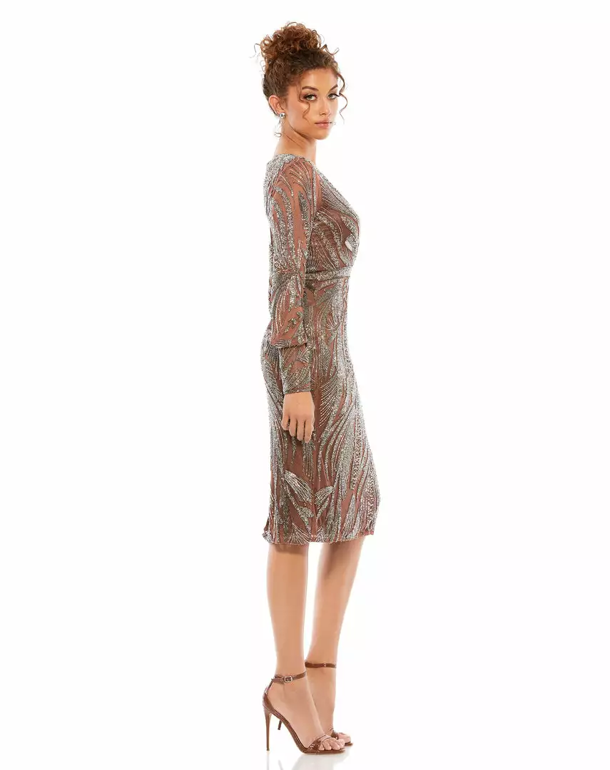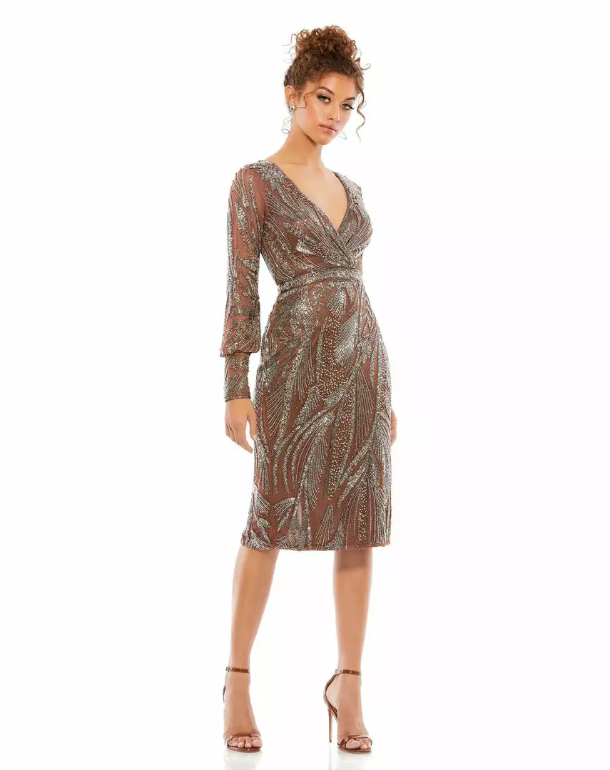 Elegant long sleeve surplice cocktail dress with intricate liquid beading throughout, sheer illusion sleeves, and a hand-beaded belt.