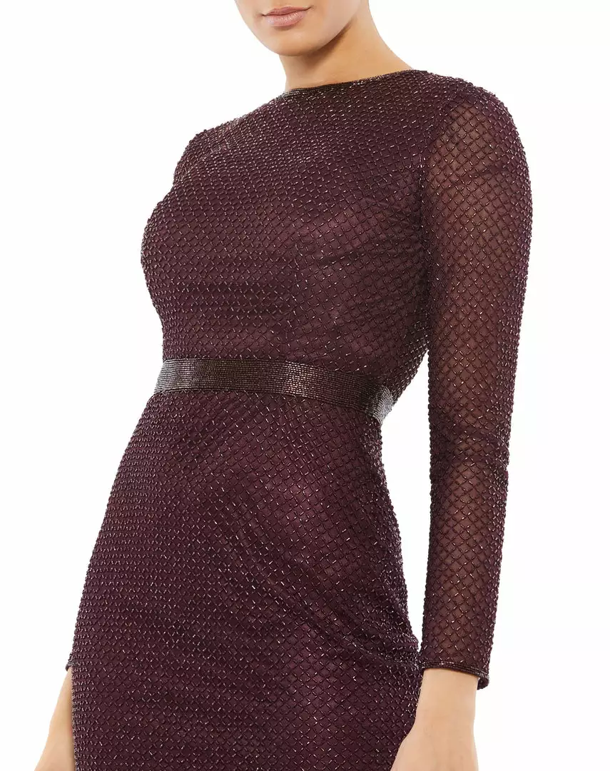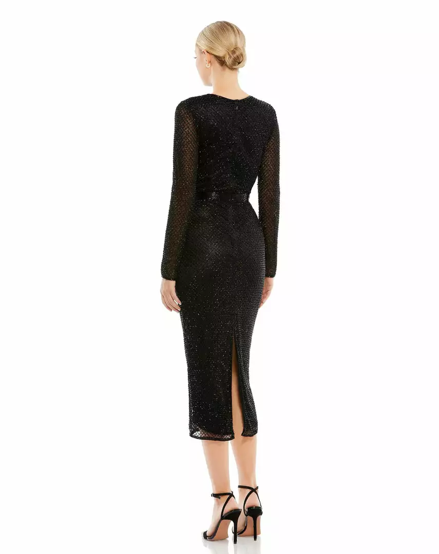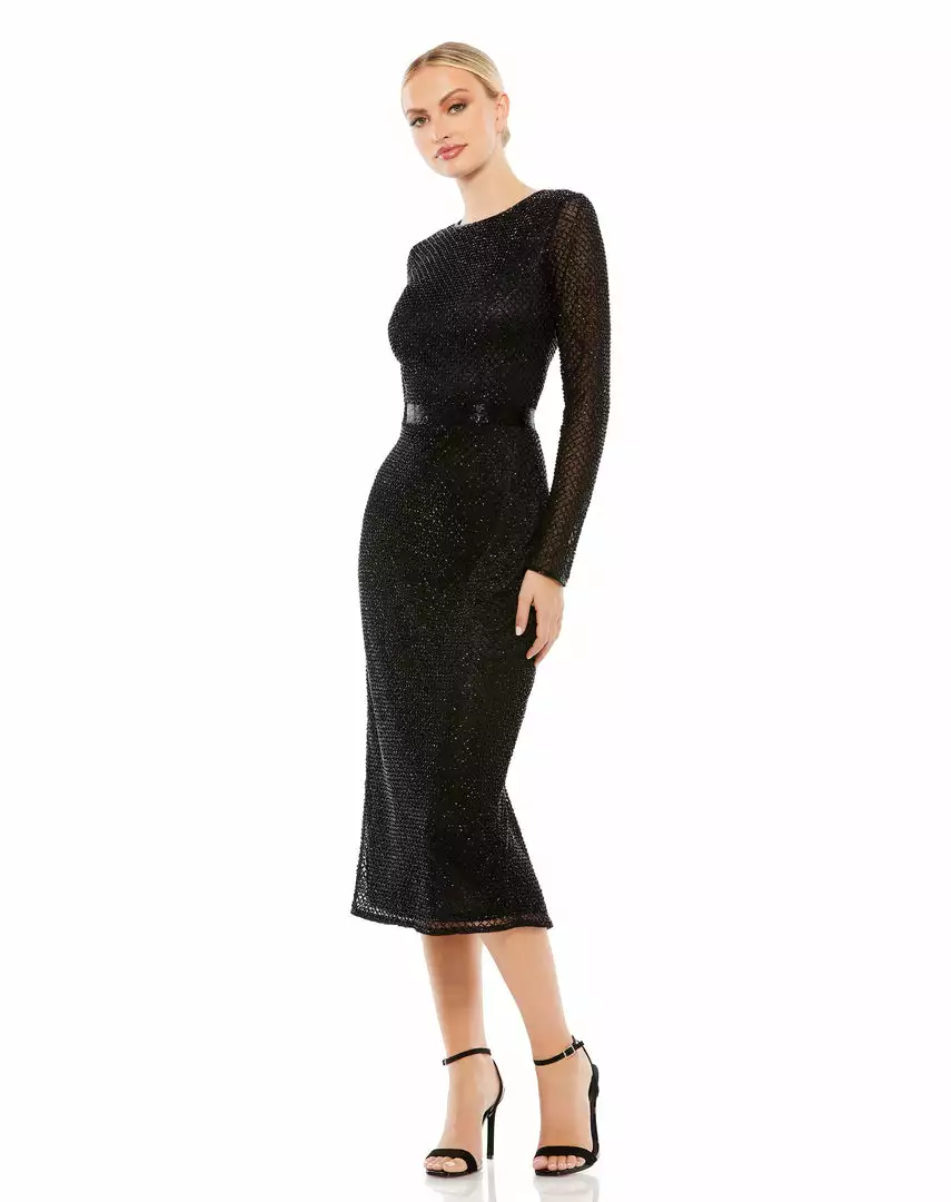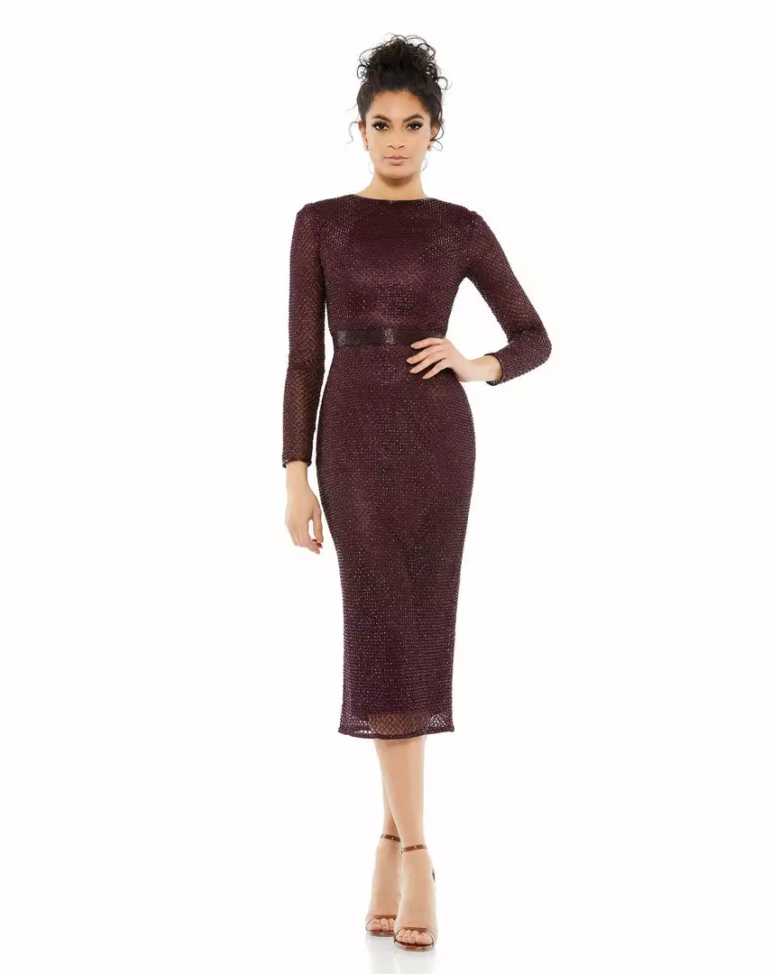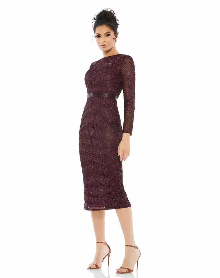 Mac Duggal Long Sleeve Lattice Beaded Midi Cocktail Dress