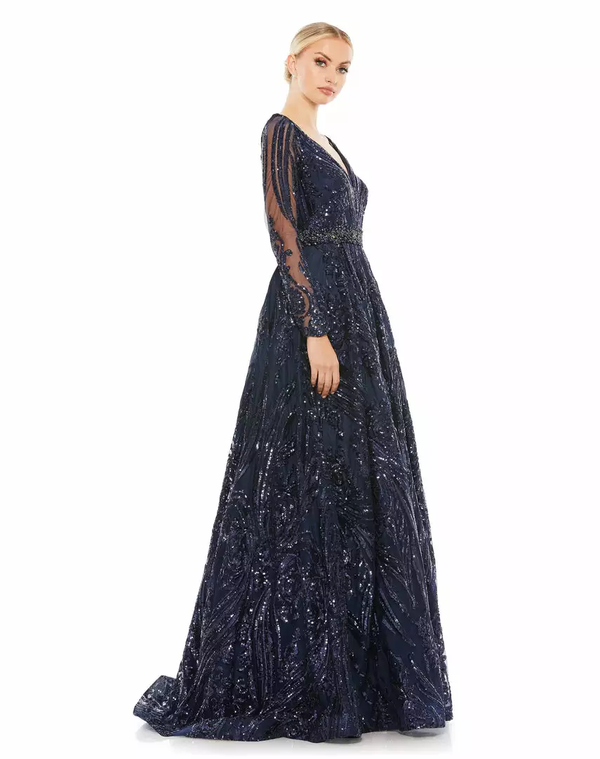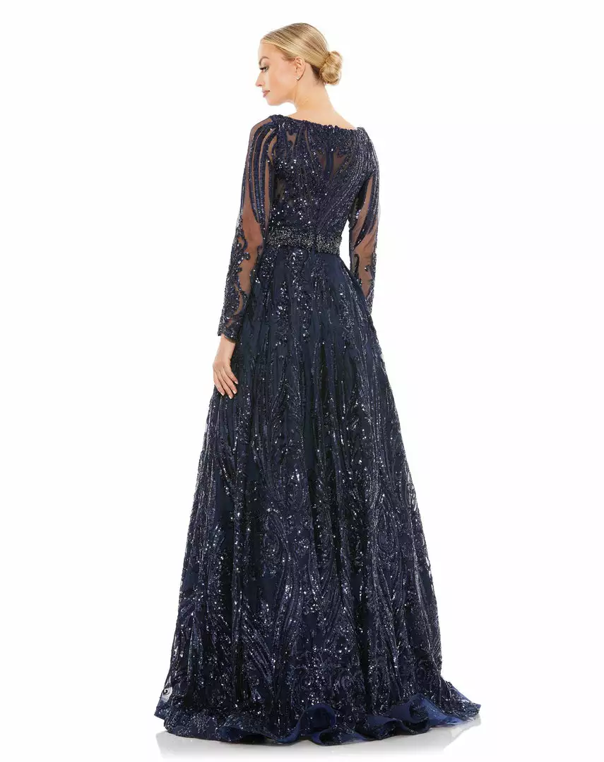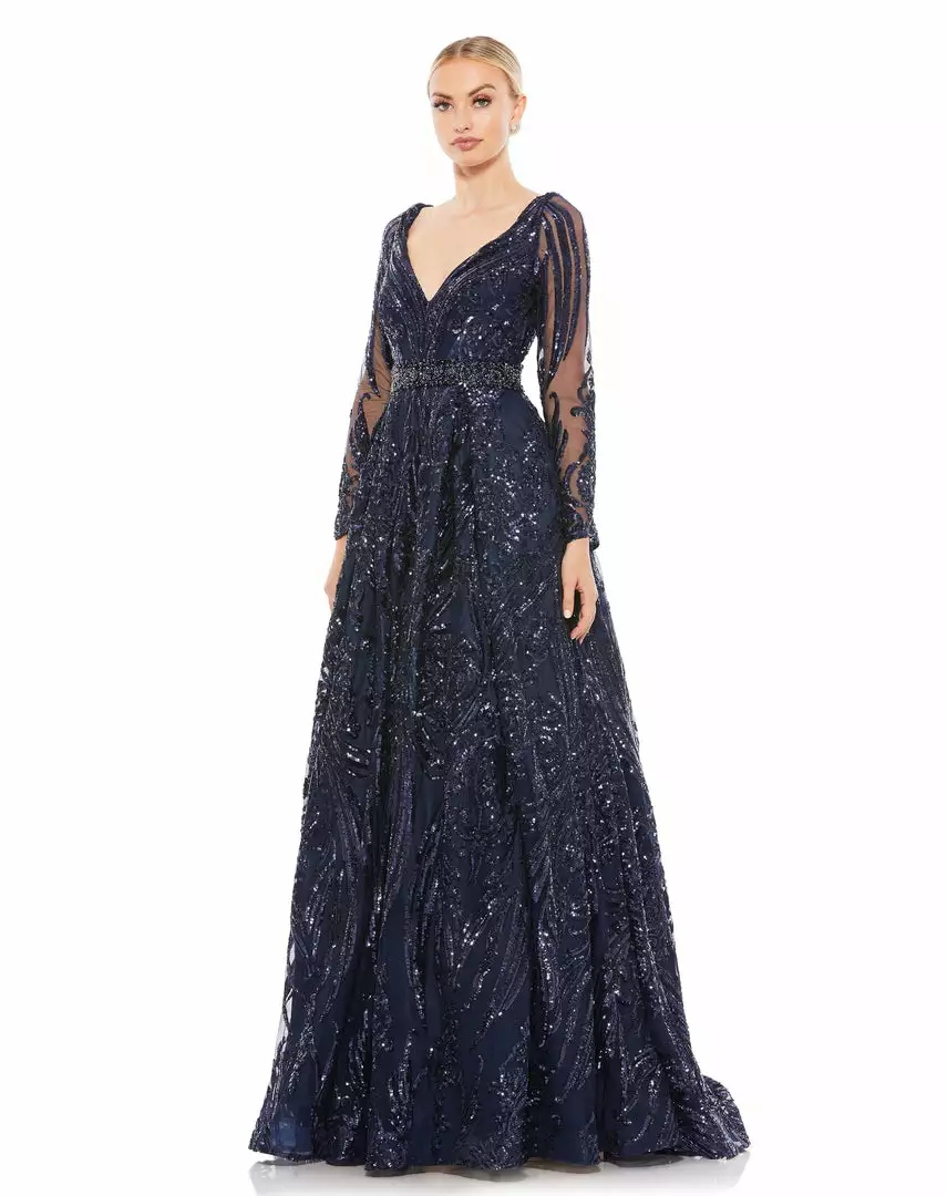 Stunning long-sleeved A-line gown with a hand-sequined mesh overlay and a beaded belt.