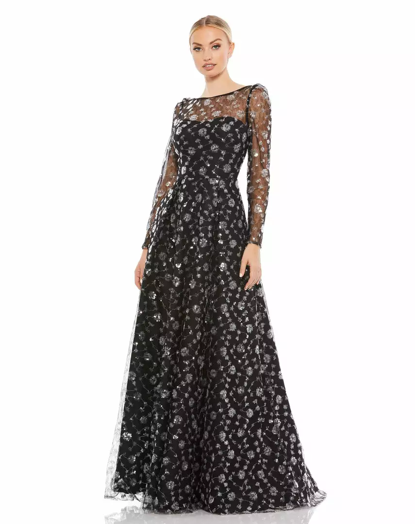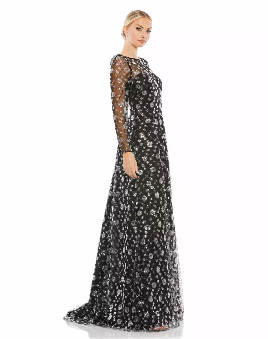 Floral illusion long sleeve A-line gown accented with sequined floral clusters throughout and a sweeping train.