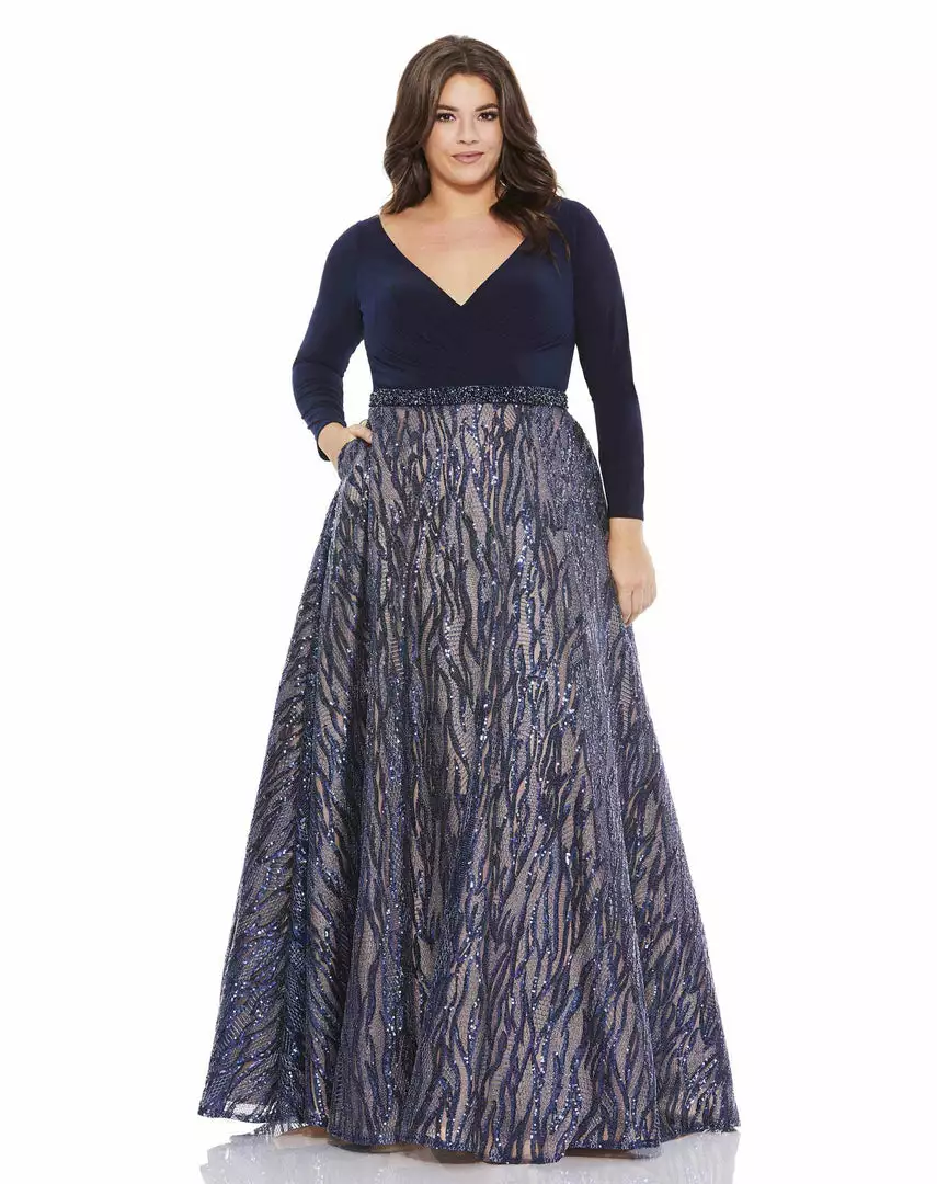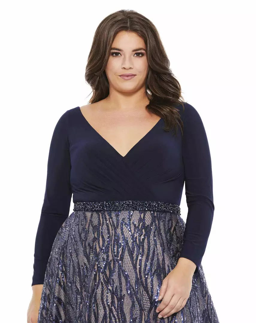 Midnight sequined A-line gown with a beaded belt and a faux-wrap bodice.