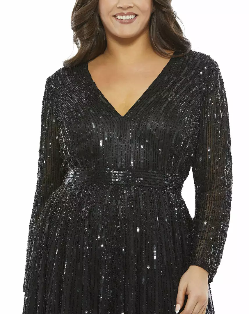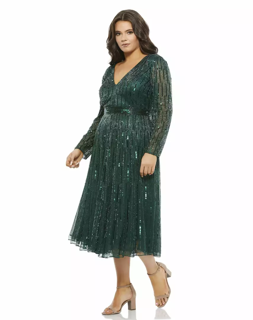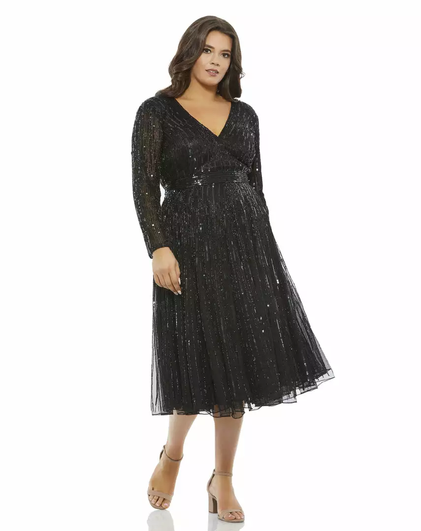 Fully embellished with vertical rows of tons sequins and beads, this dress brings the shine. The fitted bodice, sequined waistband, and flowing a-line skirt create an ultra-flattering silhouette, while the v-neckline and semi-sheer sleeves add a a bit of sexiness to this tea-length cocktail dress.