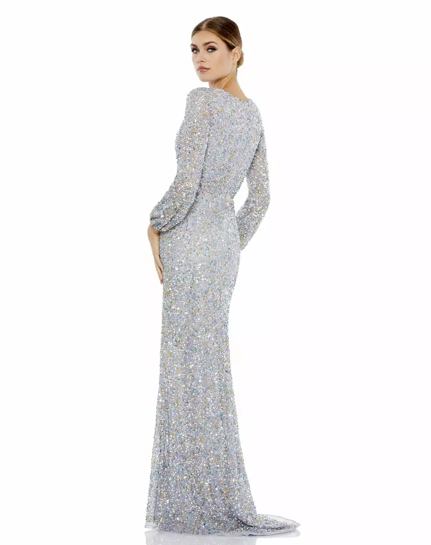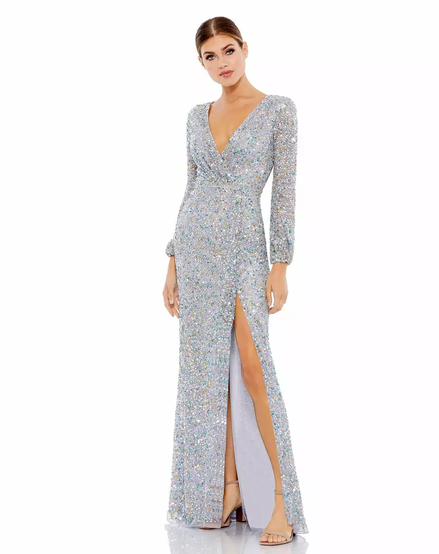 Multi-colored sequin evening gown with a plunging v-neckline, long sleeves, and thigh-high slit.