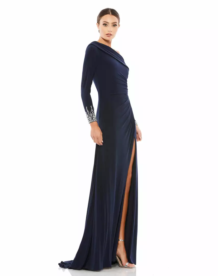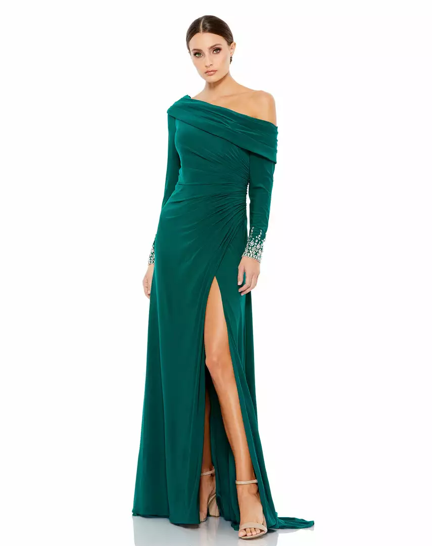 Off-the-shoulder long sleeve jersey gown accented with jeweled cuffs and a thigh-high slit.