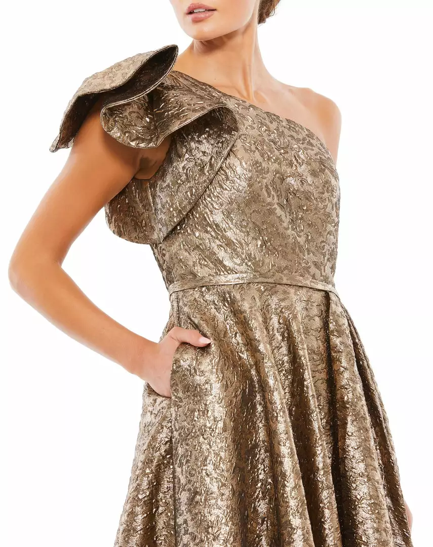 One-shoulder metallic brocade ball gown accented with a thigh-high slit and pockets.
