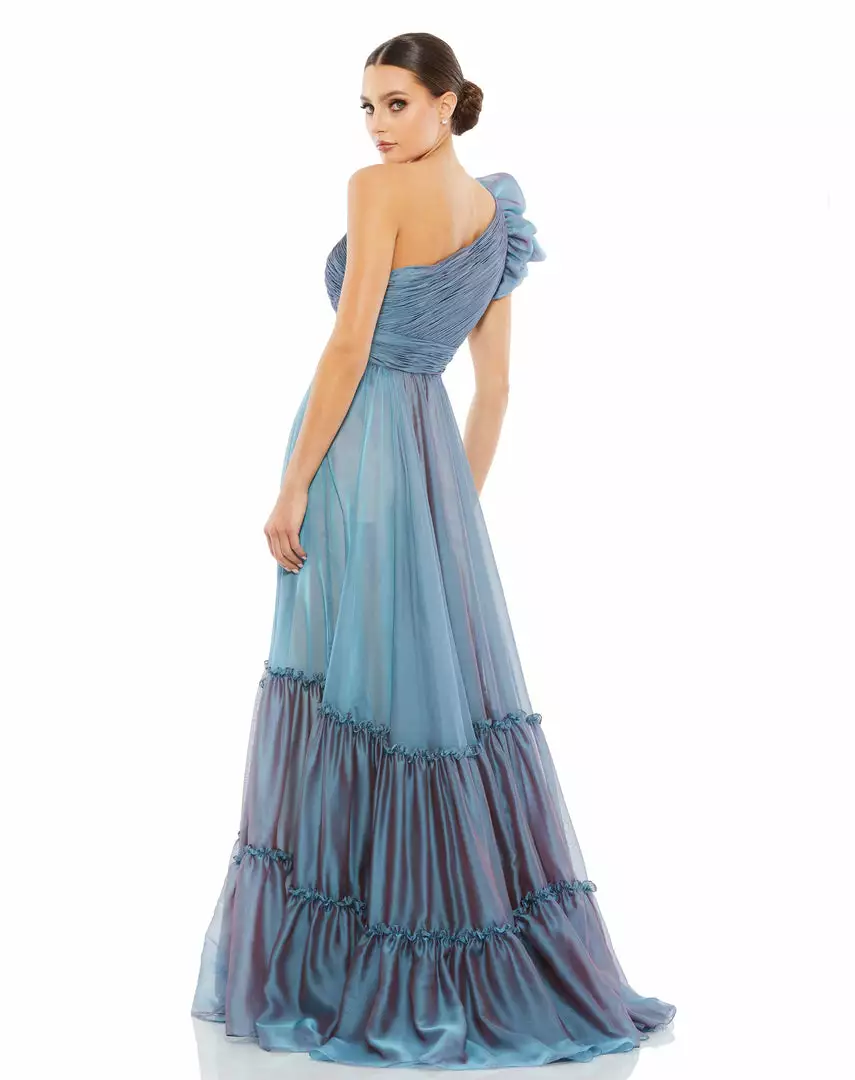 Be prepared for non-stop compliments in this plucked-from-your-dreams gown. Between the iridescent organza fabric, texture-rich plissé pleating, avant-garde-inspired ruffled shoulder, and a billowy tiered skirt, this gown is guaranteed to turn every head in the room. Keep accessories to a minimum to let the gorgeous detail shine.