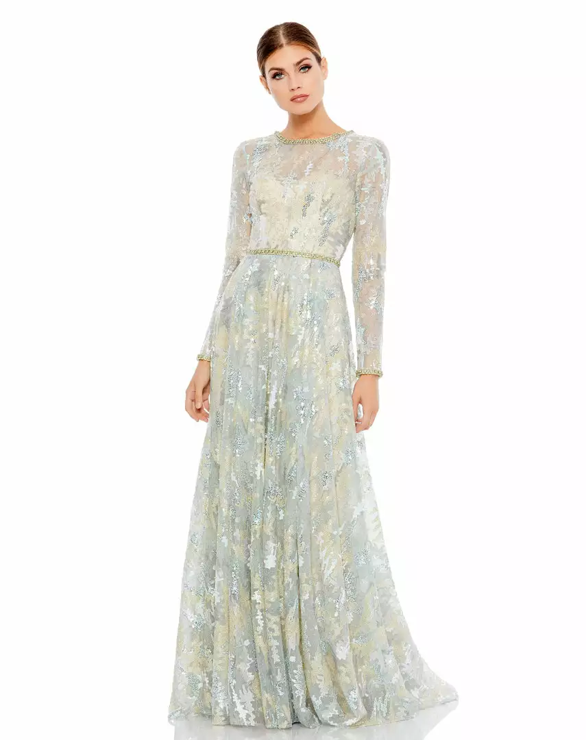 This stunning illusion long sleeve A-line gown. The illusion overlay is embroidered and embellished with sequins and hand-beaded floral accents. The gown is finished with a a rhinestone embellished belt, neckline, and cuffs.