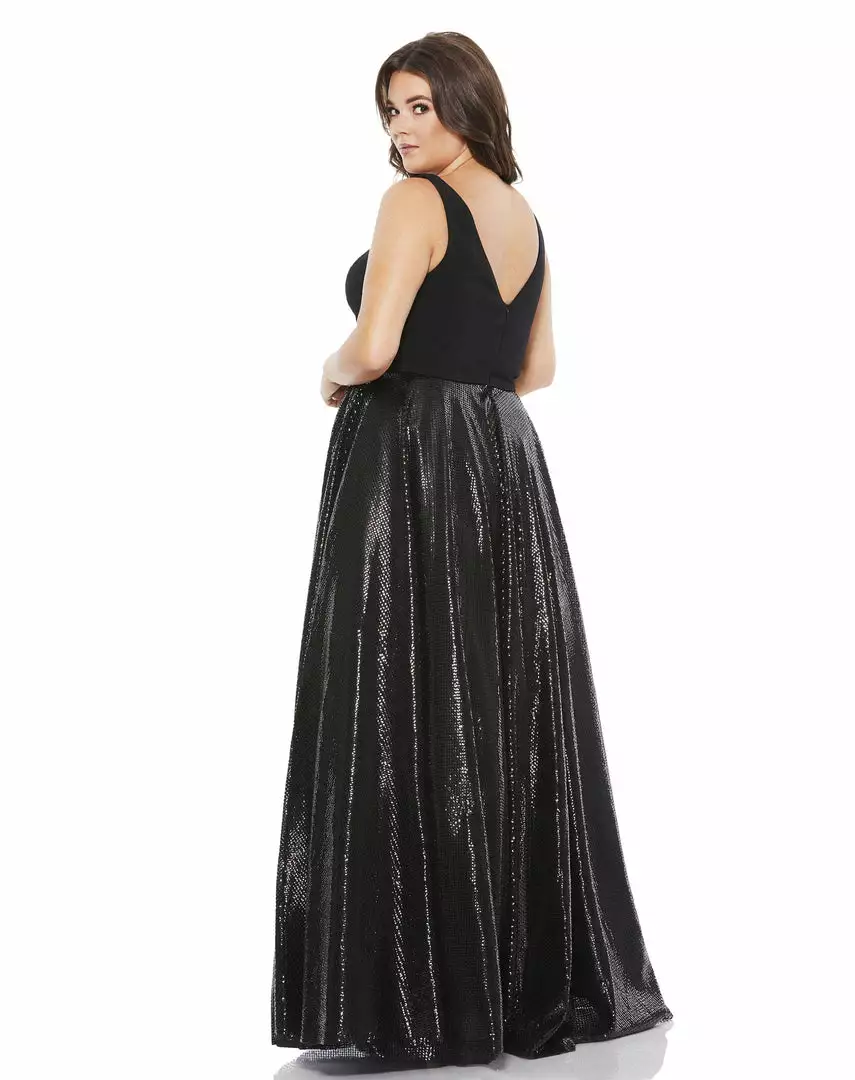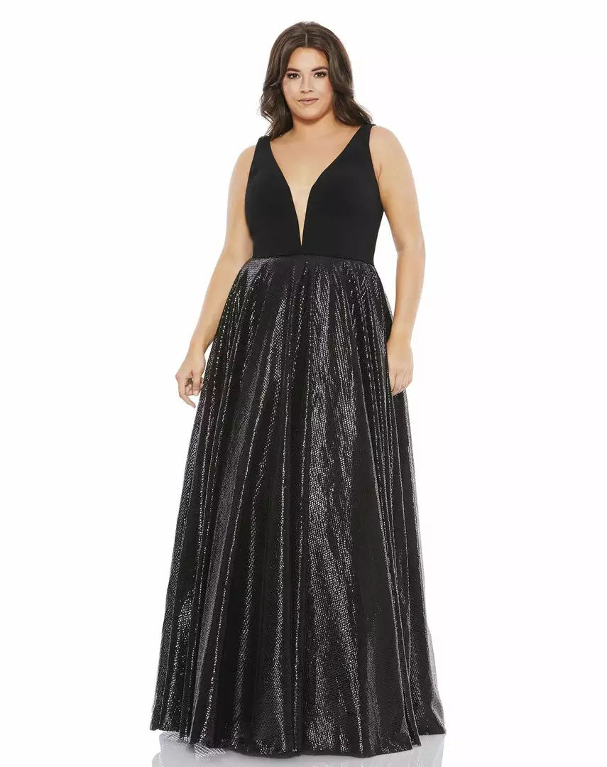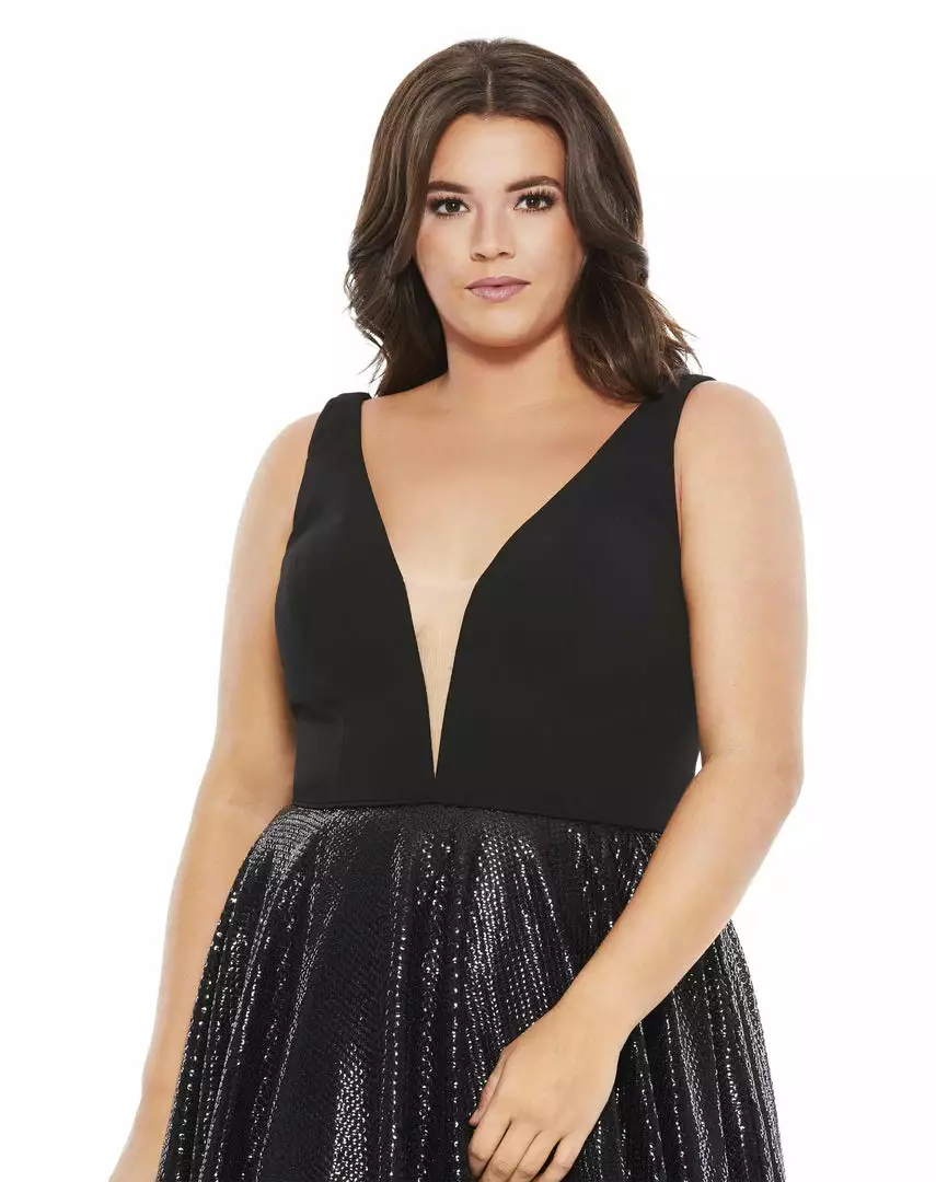 Plunging black ball gown with mesh insert at bra line and dramatic sequined skirt.