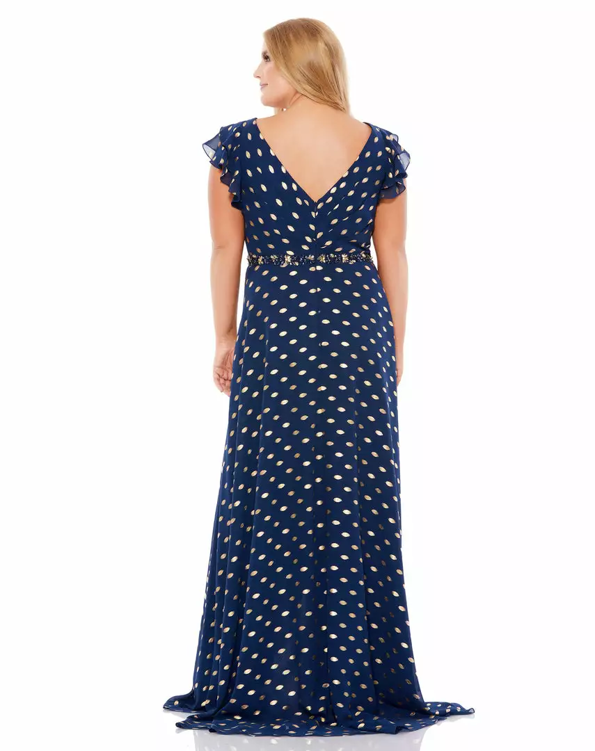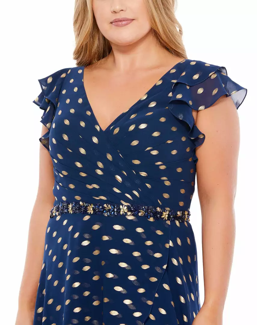 Mac Duggal Polka Dot Faux Wrap Ruffled Cap Sleeve Gown (Plus) Plus Size