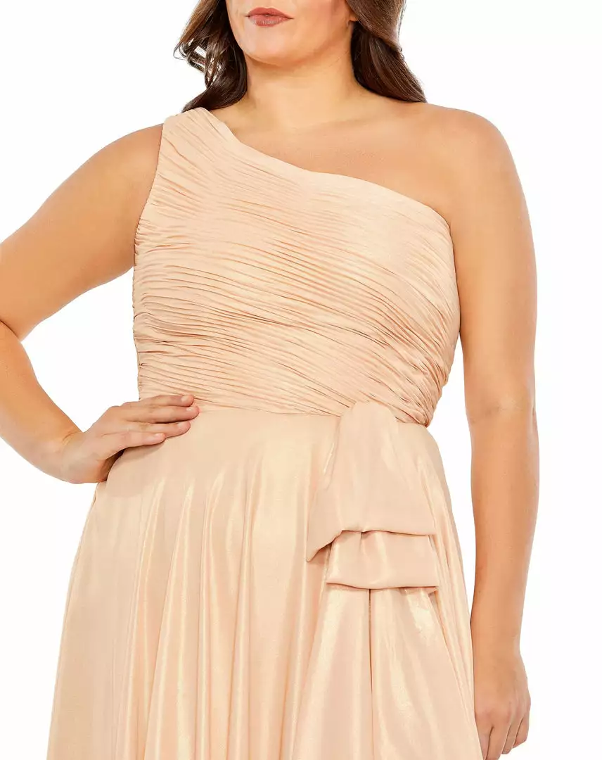 Mac Duggal Ruched One Shoulder Soft Tie Draped A Line Gown (Plus) Shop For