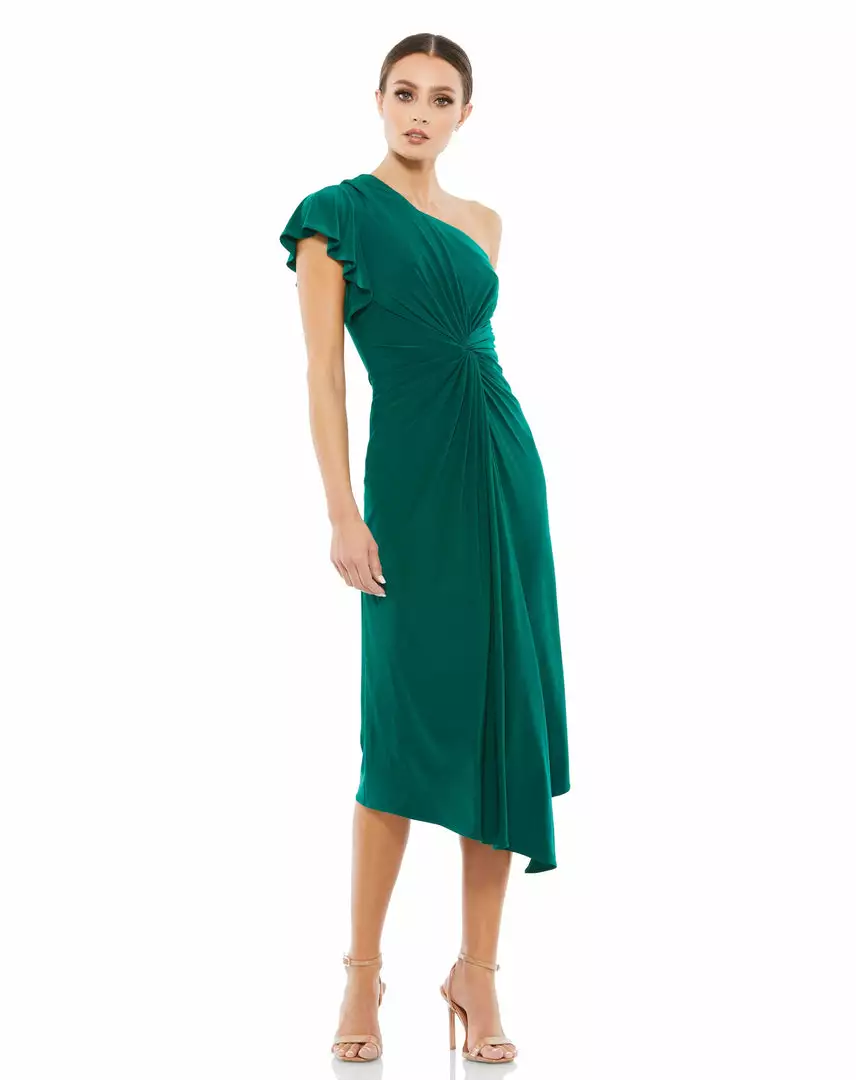 Mac Duggal Ruffled Asymmetric Midi Jersey Gown