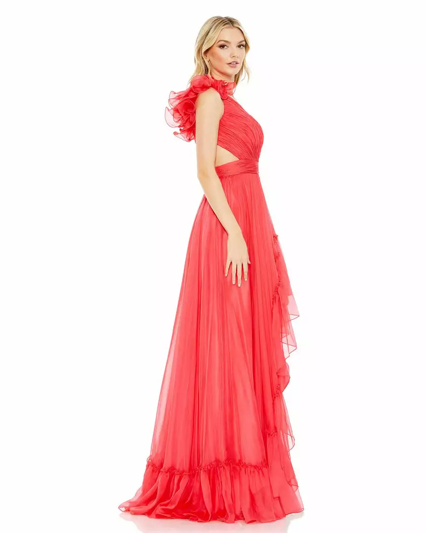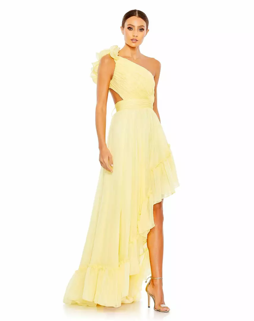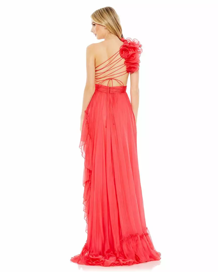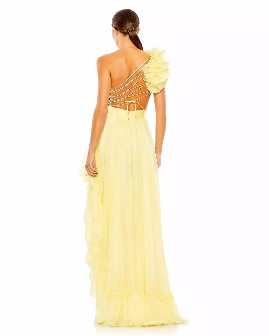 Made from breezy chiffon, the dress is designed with a flirty asymmetrical cut that features a one-shoulder top and diagonal ruffle trim. A frilly shoulder accent and strappy back lacing bring the fashion.