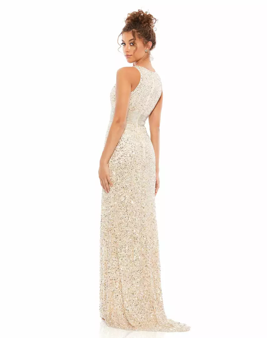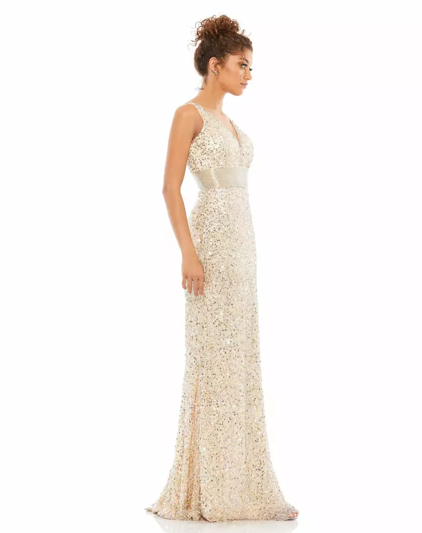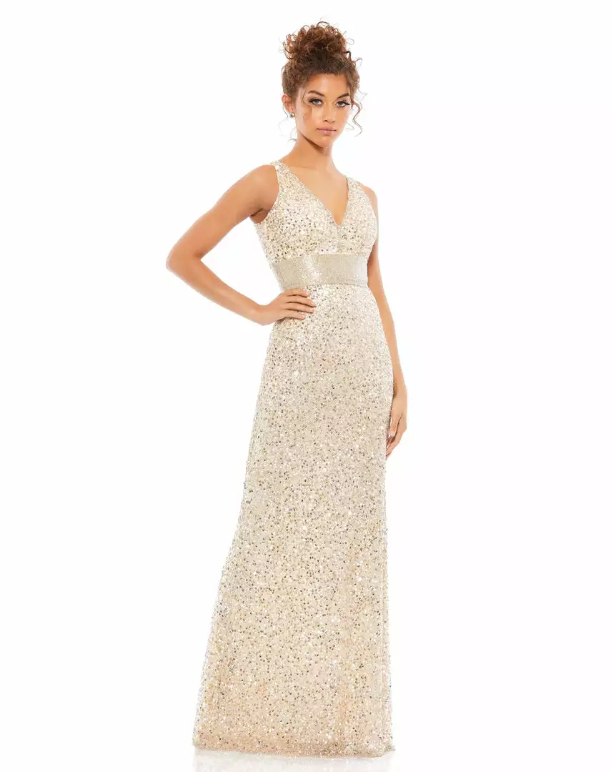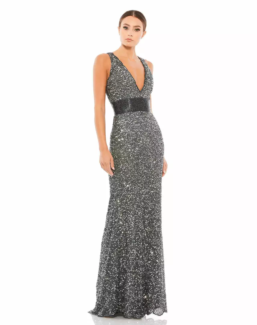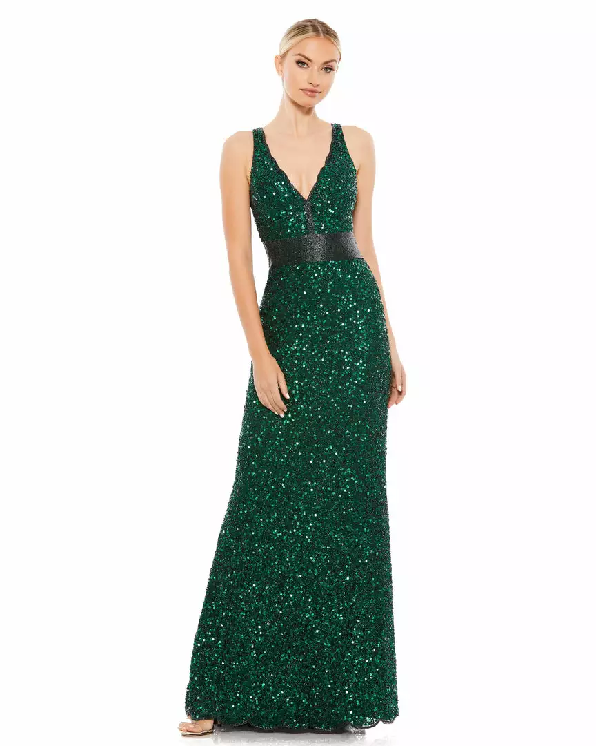 This figure-flattering evening gown is covered top-to-bottom in stunning sequins. The plunging scalloped neckline is trimmed with beads, and a wide hand-beaded waistband cinches in the midsection. The floor-length skirt is finished with a sweeping train.Â