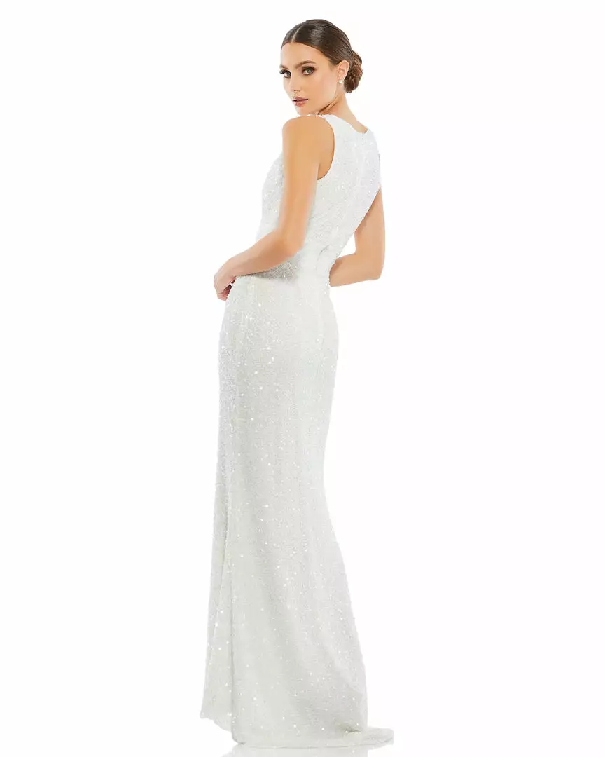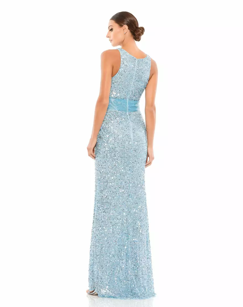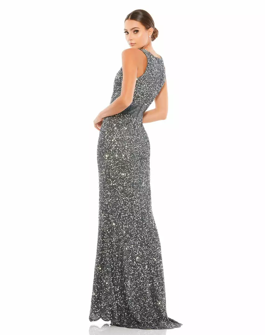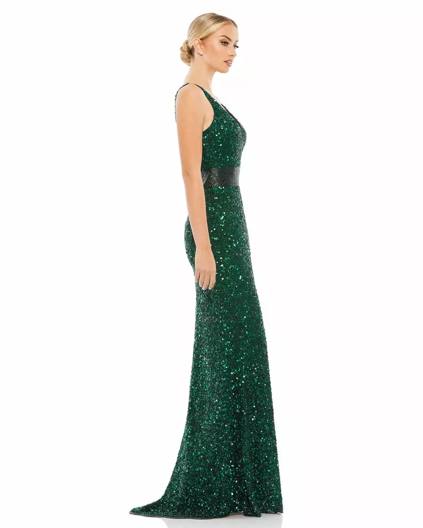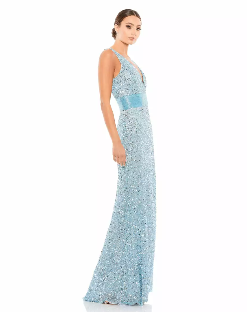 This figure-flattering evening gown is covered top-to-bottom in stunning sequins. The plunging scalloped neckline is trimmed with beads, and a wide hand-beaded waistband cinches in the midsection. The floor-length skirt is finished with a sweeping train.Â