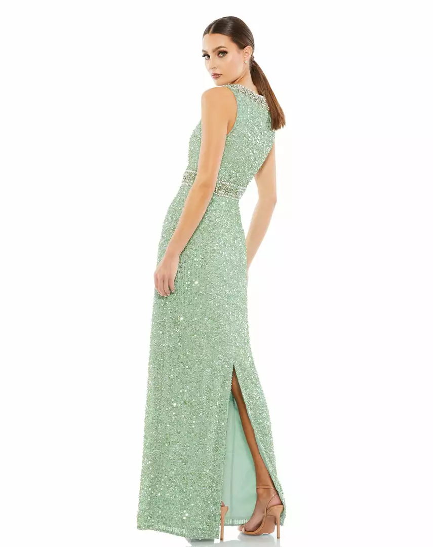 Fully-sequined, floor-length sleeveless column gown featuring a dramatic jewel-embellished collar, a jewel-embellished waist, and a center back slit.