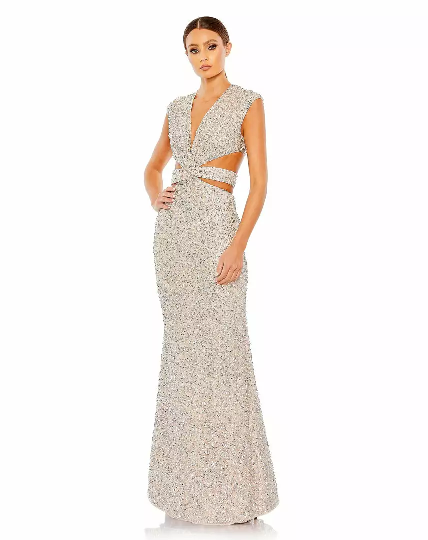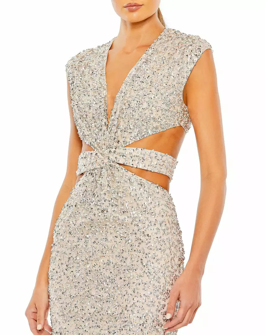 Mac Duggal Sequined Cap Sleeveless Plunge Neck Cut Out Gown Shop For