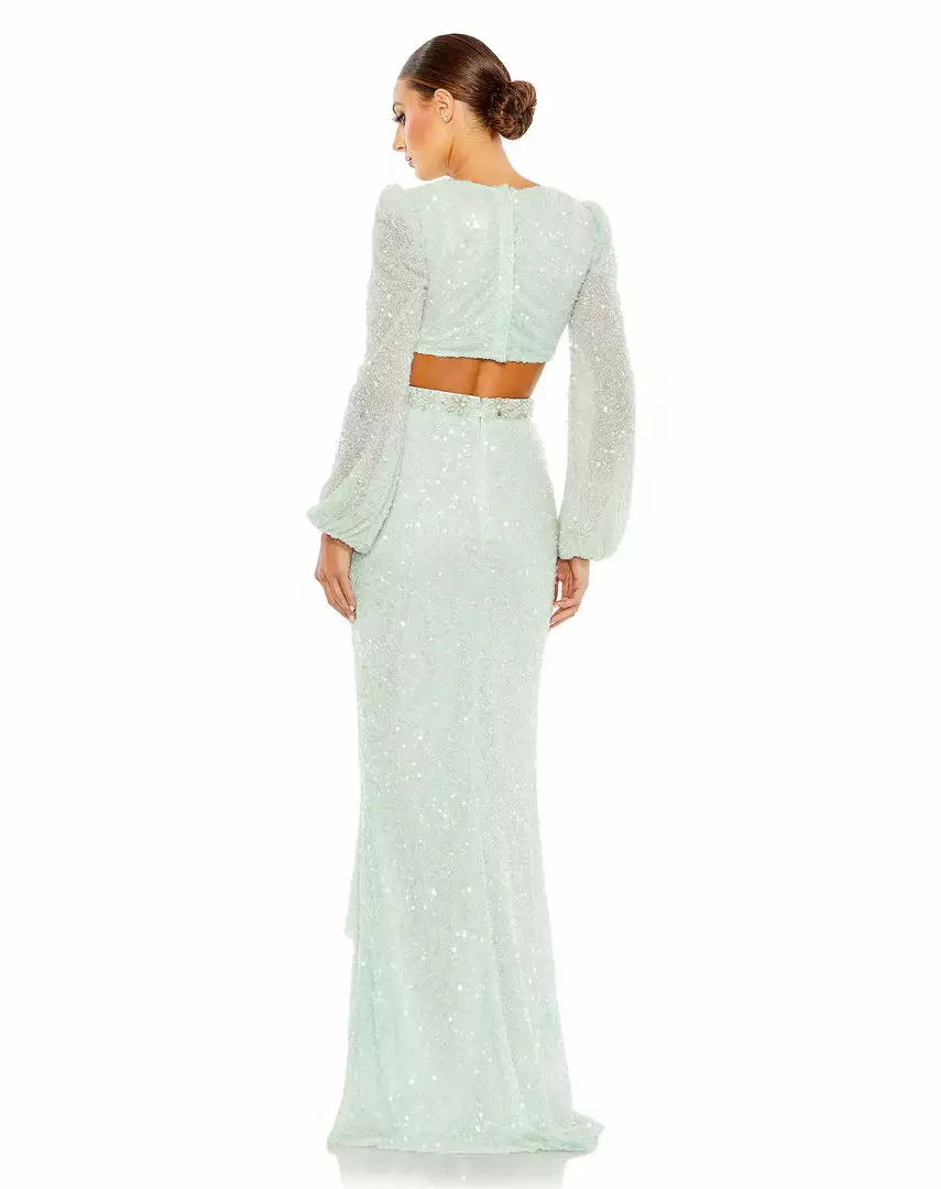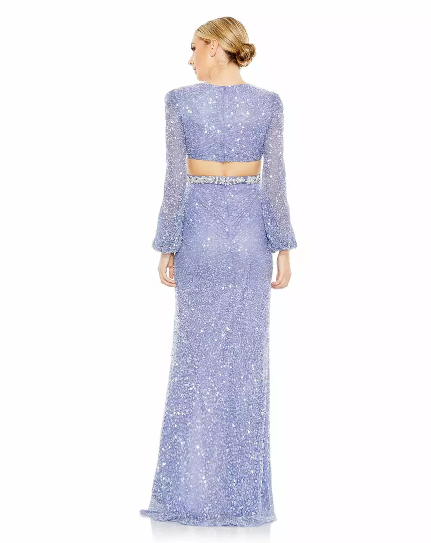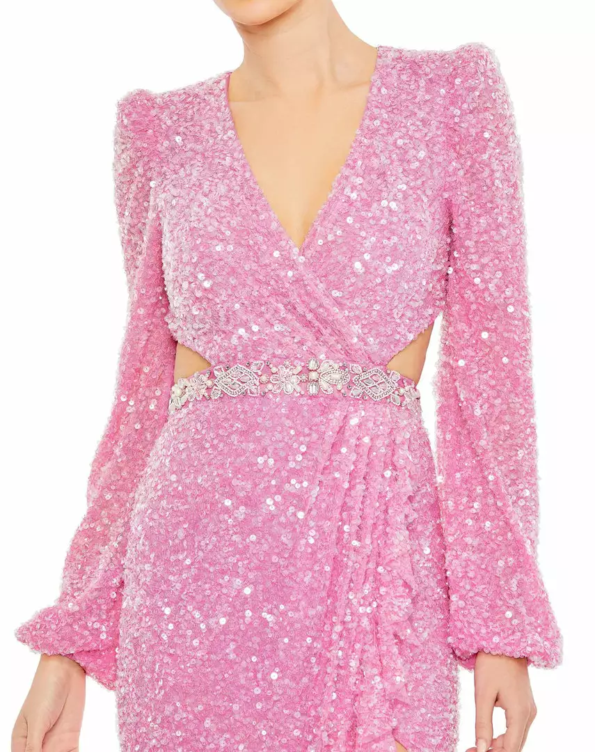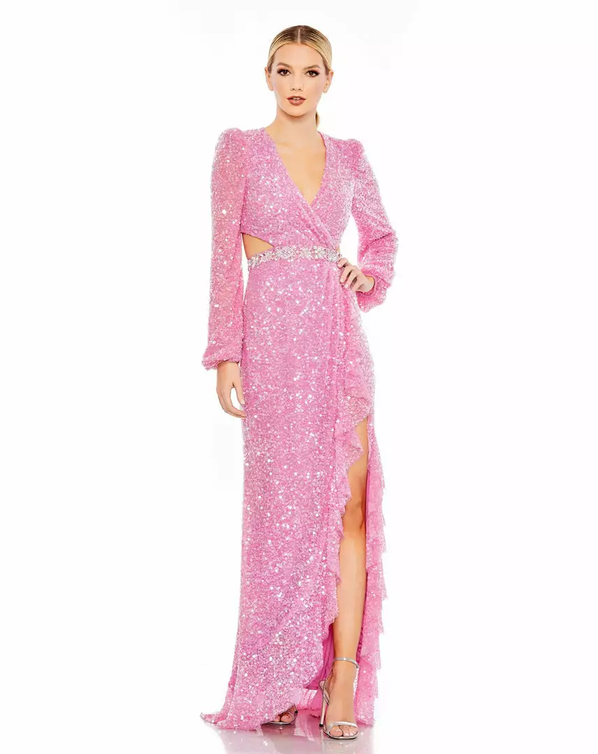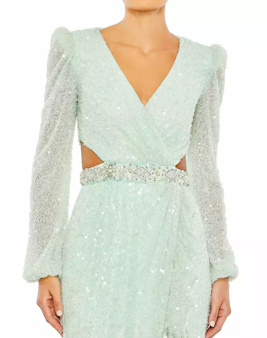 Mac Duggal Sequined Faux Wrap Cut Out Puff Sleeve Gown Shop For
