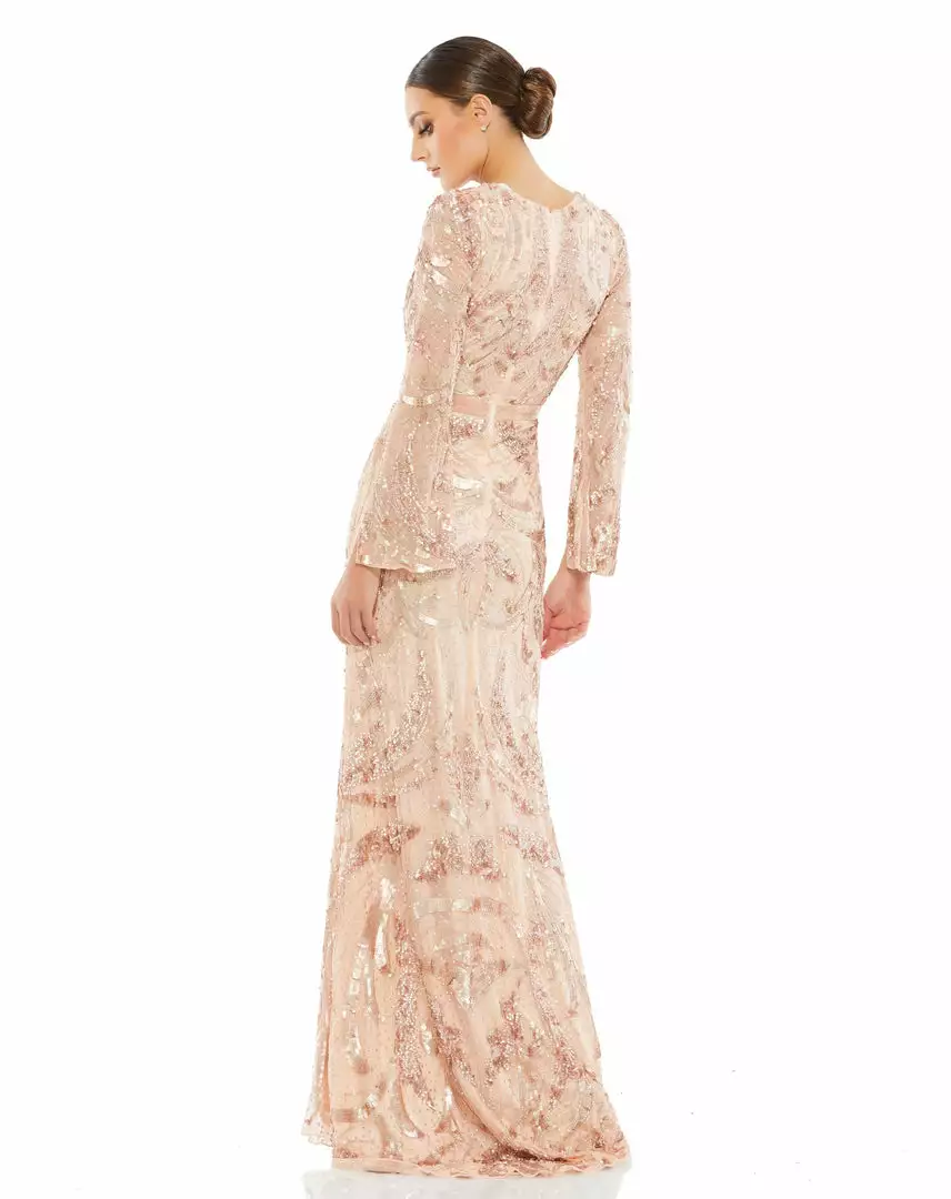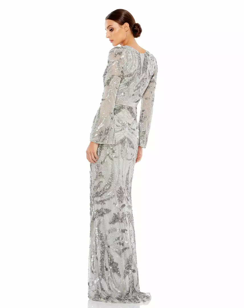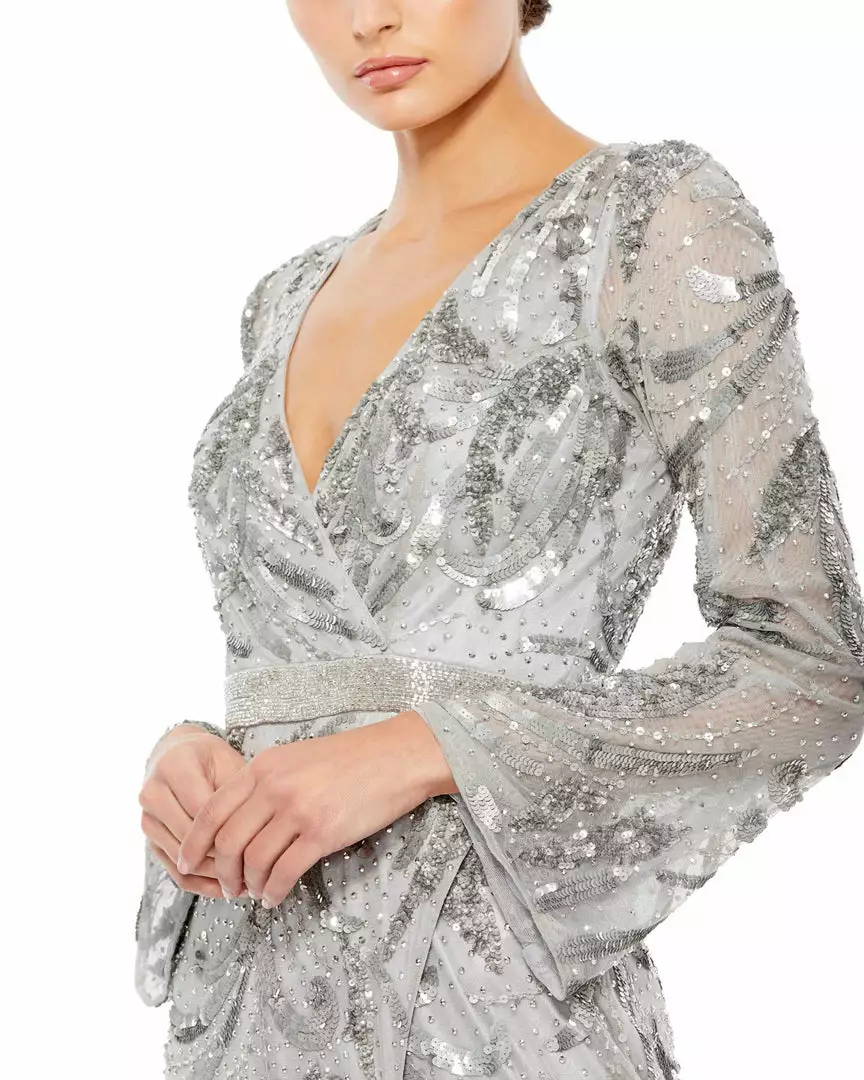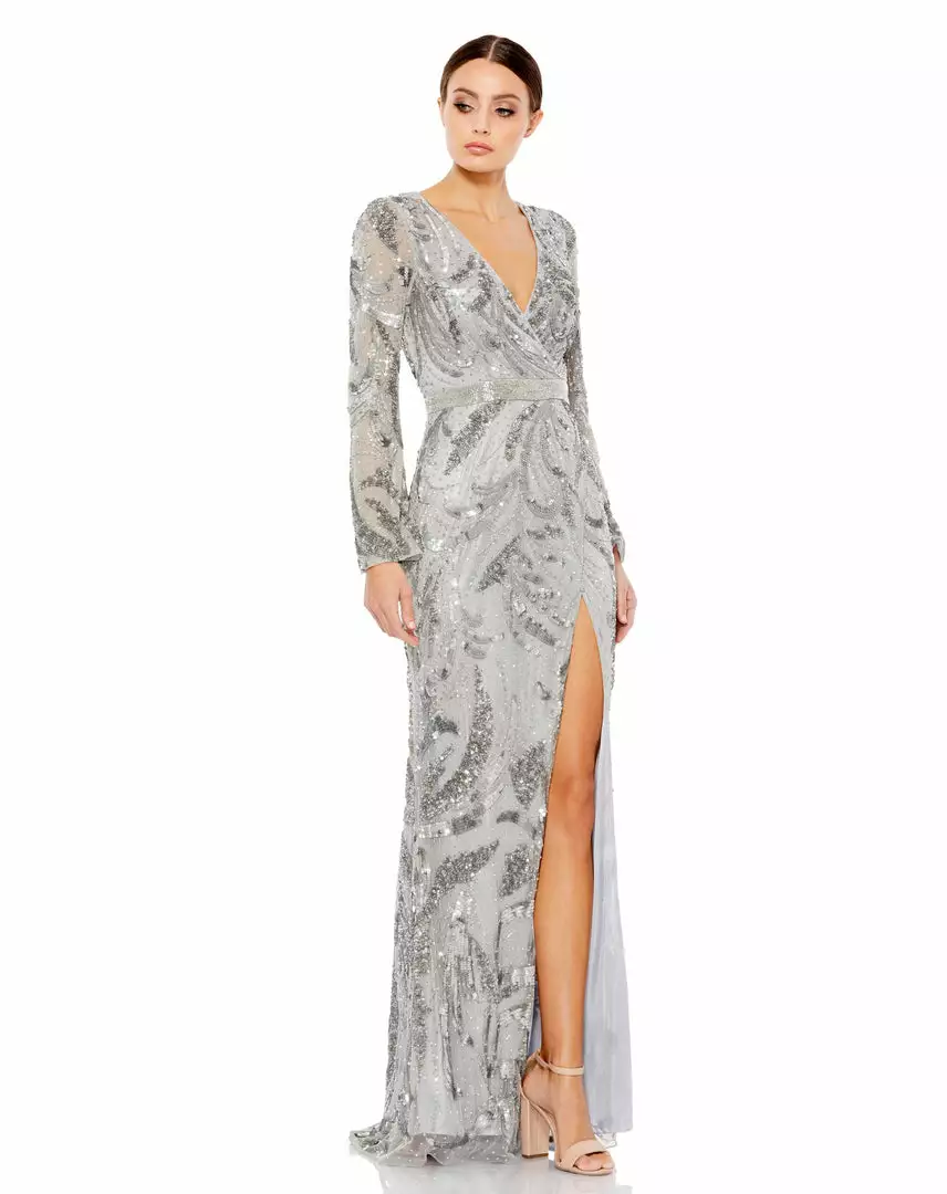 Mac Duggal Sequined Faux Wrap Split Long Sleeve Gown Shop For