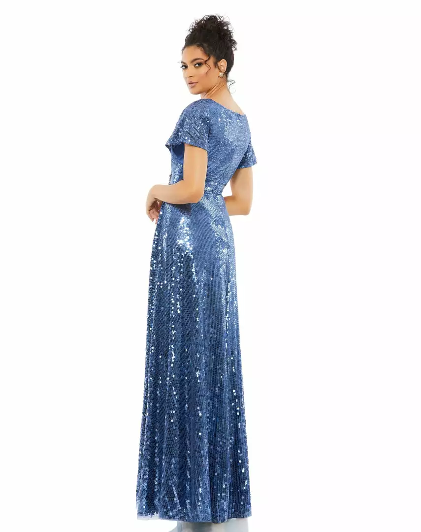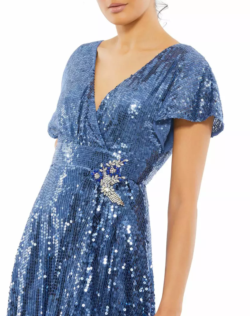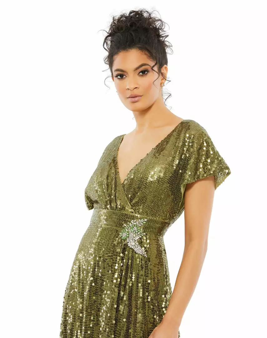 Covered in high-shine sequins, this floor-length gown is a lesson in how to make a beautiful, bold impression. Made to dazzle in any season, the floor-sweeping dress is styled with a surplice neckline, fluttery sleeves that offer upper arm coverage, and a lavish removable rhinestone brooch at the waist.
