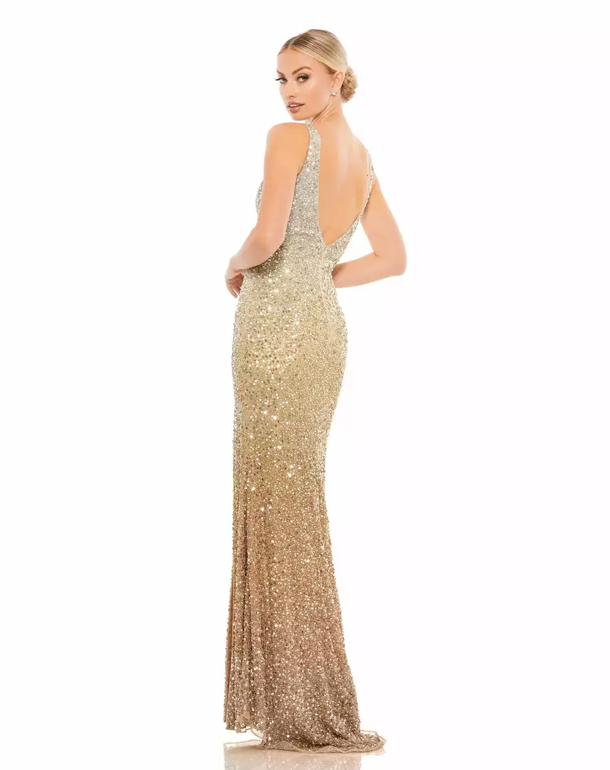 Fully sequined and hand-beaded gown with a plunging v-neckline and low scoop back. Floor length skirt features a high slit and a sweeping train.Â