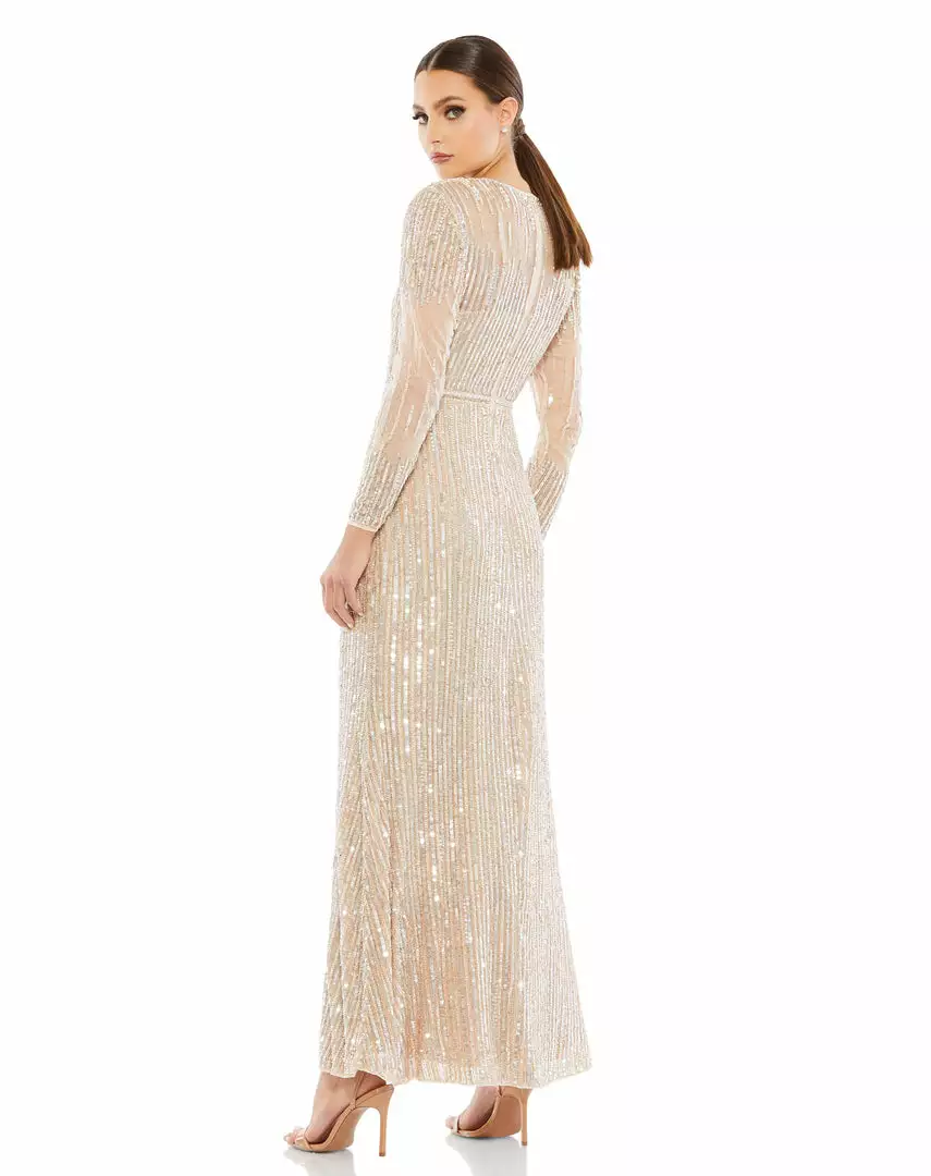 Elegant, fully-embellished dress with a high round neckline and semi-sheer yoke and sleeves. Vertical rows of sequins and beads adorn the bodice, skirt, and sleeves, and the natural waist and neckline feature hand-sewn crystal accents.