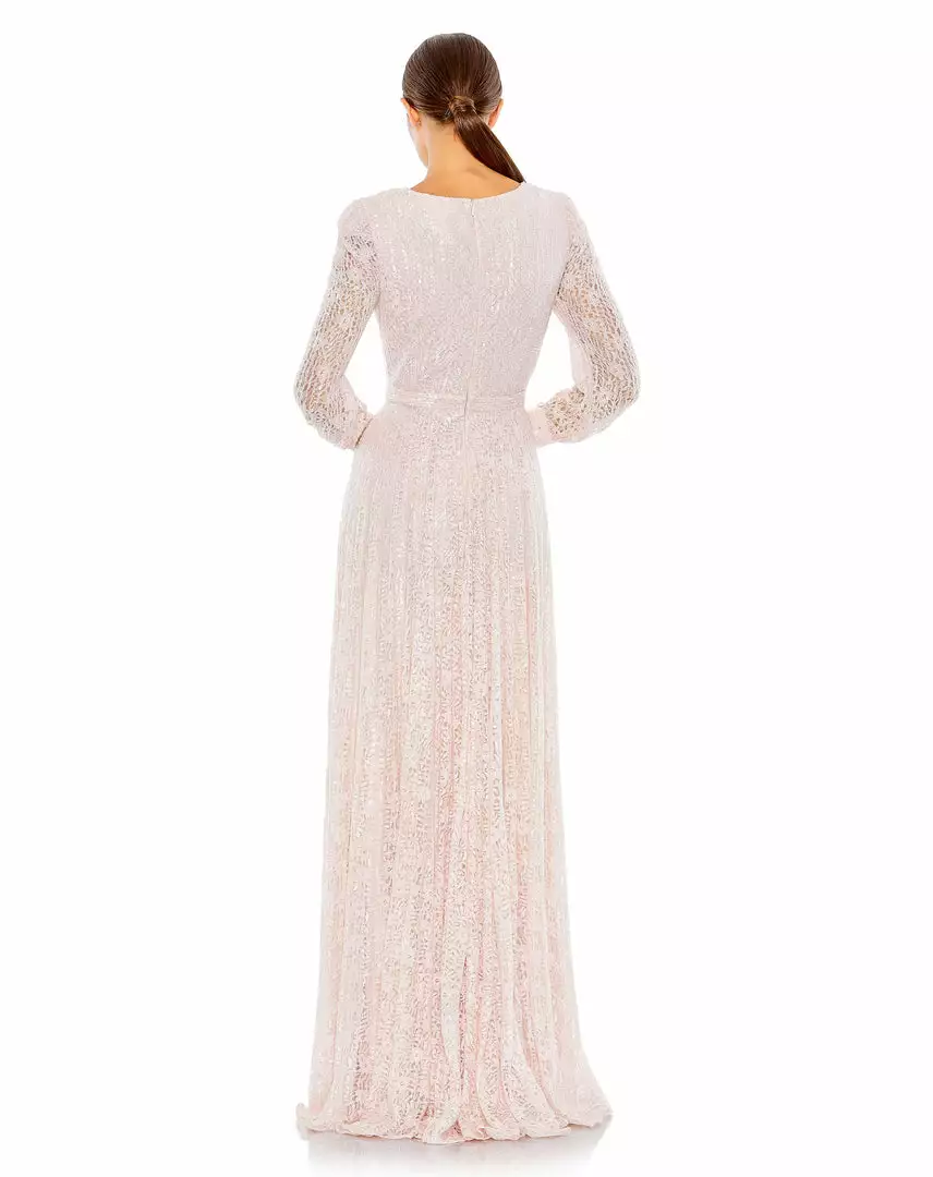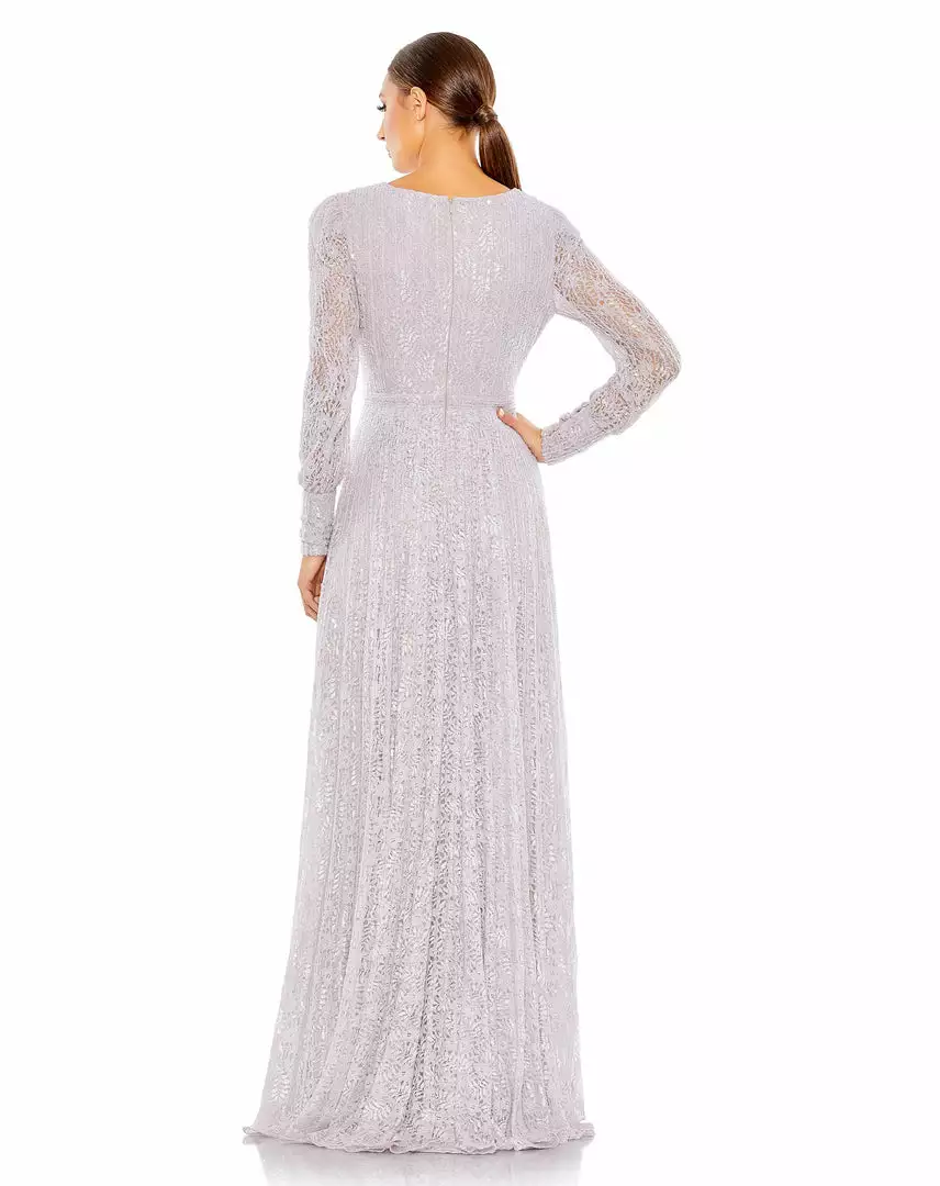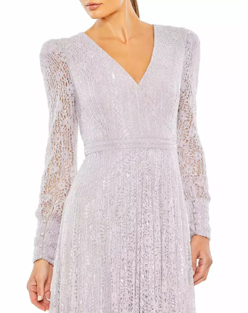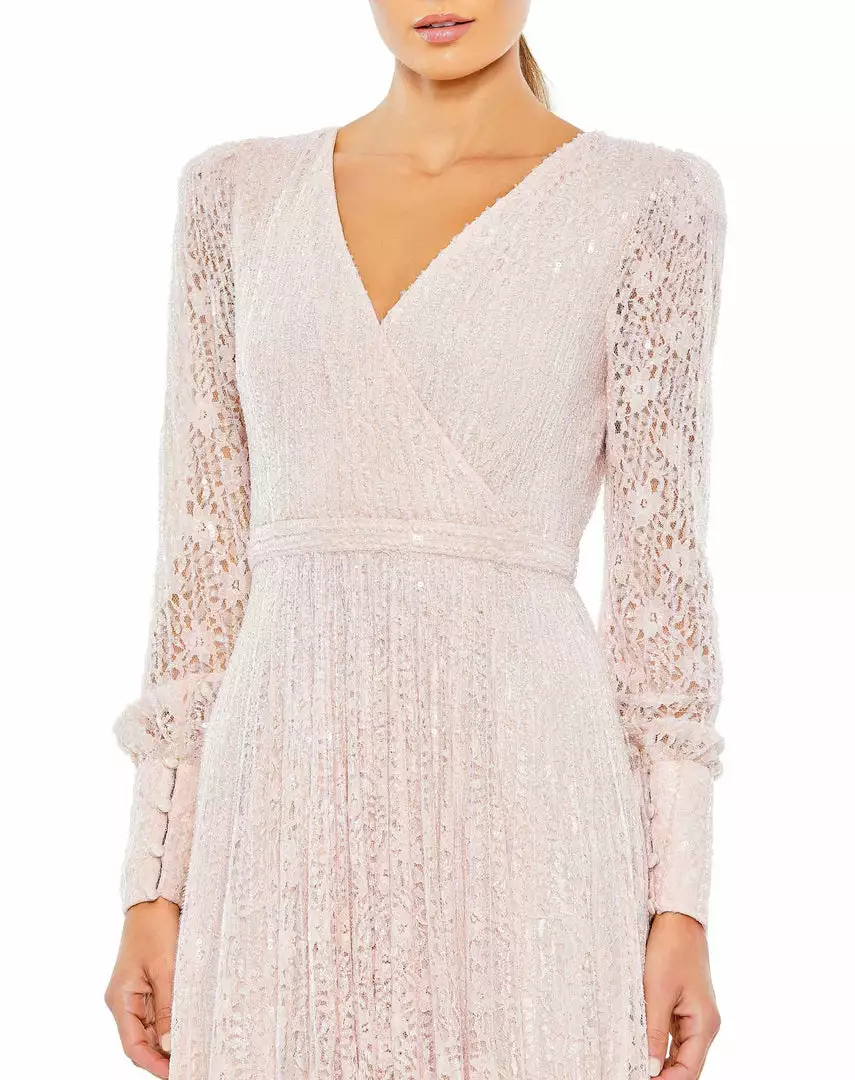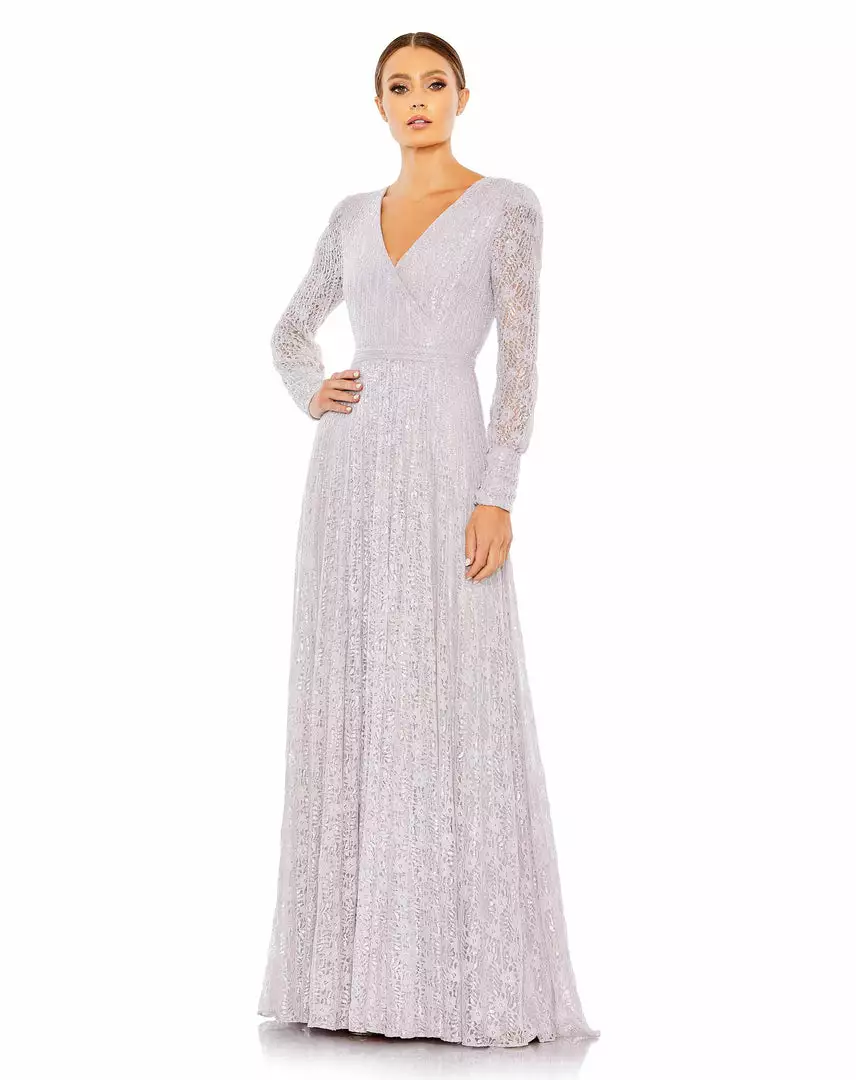 Mac Duggal Sequined Lace Long Sleeve Wrap Over Gown