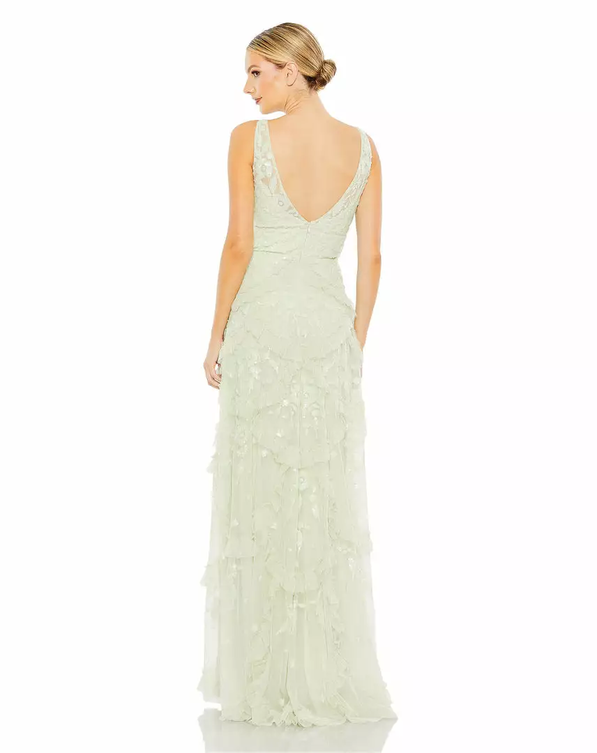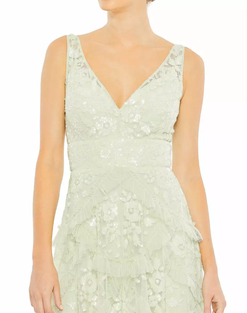 Mac Duggal Sequined Scallop Ruffle Tiered V Neck Gown